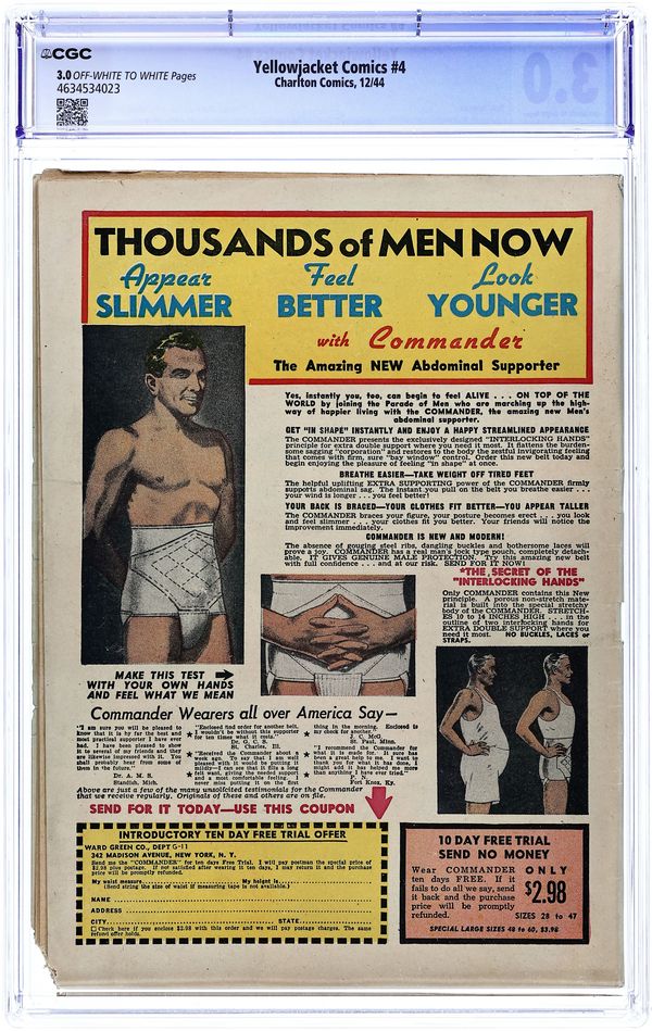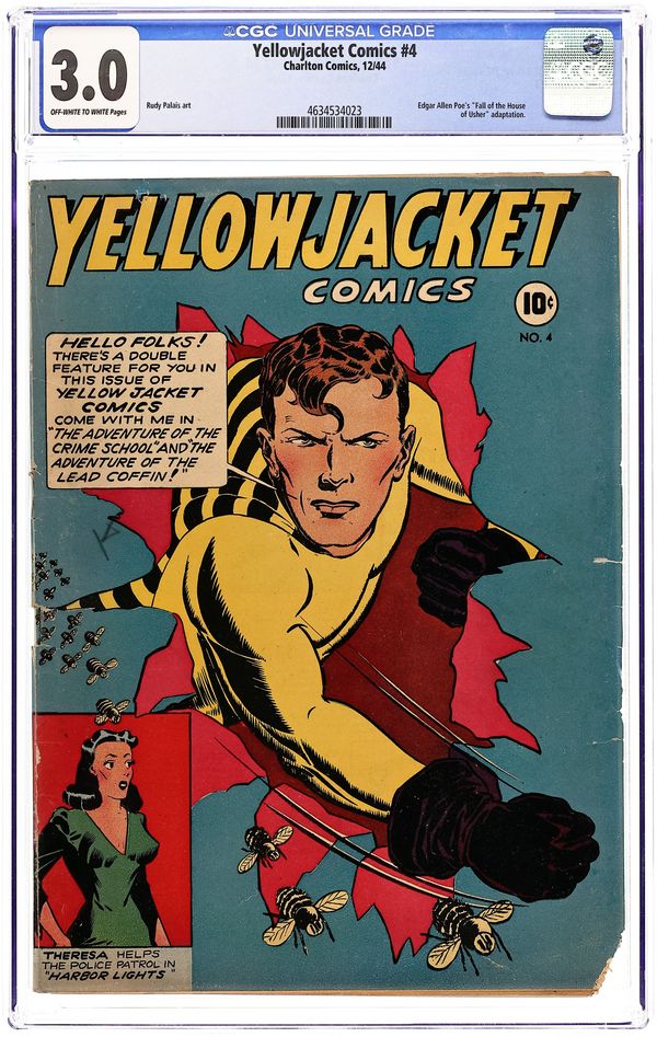 Stories and art by Ken Battefield, Paul Gattuso, Leo Morey, Harold DeLay, Gus Schrotter, and Rudy Palais. An early comics anthology focusing on Yellowjacket and other little-known superheroes of the Golden Age. An ex-convict sets up a "crime school" to pass along illicit knowledge, until Yellowjacket gets wind of it. Diana the moon goddess intervenes when bandits attack American relief shipments to Nazi-beleaguered Greece. Steve of the harbor police learns that a gang plans to rob a cocaine smuggler's ship, and sets out to get there first. Plus, the early horror feature Tales of Terror adapts Edgar Allan Poe's The Fall of the House of Usher. Yellowjacket: The Steel Coffin Case; Diana the Huntress; Out of Commission; Famous Tales of Terror: The Fall of the House of Usher; Debunker; King of the Beasts: Circus Saboteur; Harbor Lights; Bee Lines. 52 pages, Full Color. Cover price $0.10.