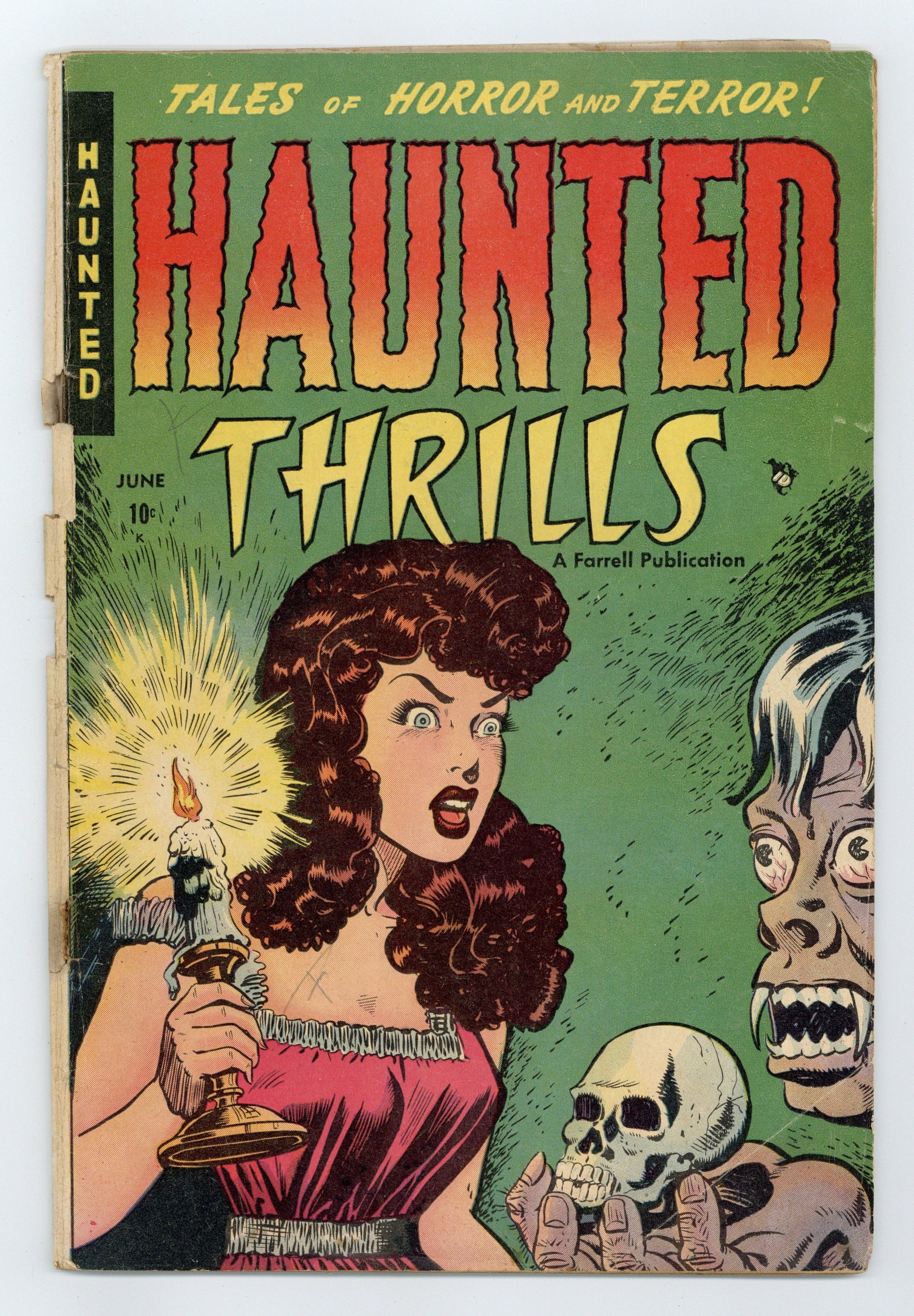 Pre-Code horror comics from Ajax-Farrell and their anonymous talents. A cop loses his badge for insisting that a haunted house is responsible for a series of murders. Bolton Baker encounters Gloria, who acts as bait for a werewolf's victims. Grimm, the Ghost Doctor, finds a love triangle at the heart of a woman's unearthly melancholy. Nightmare Mansion; Horror Hour; The Strange Bell of Obani!; Grimm, Ghost Doctor: Music and Mayhem; Monsters for Rent.... 36 pages, Full Color. Cover price $0.10.