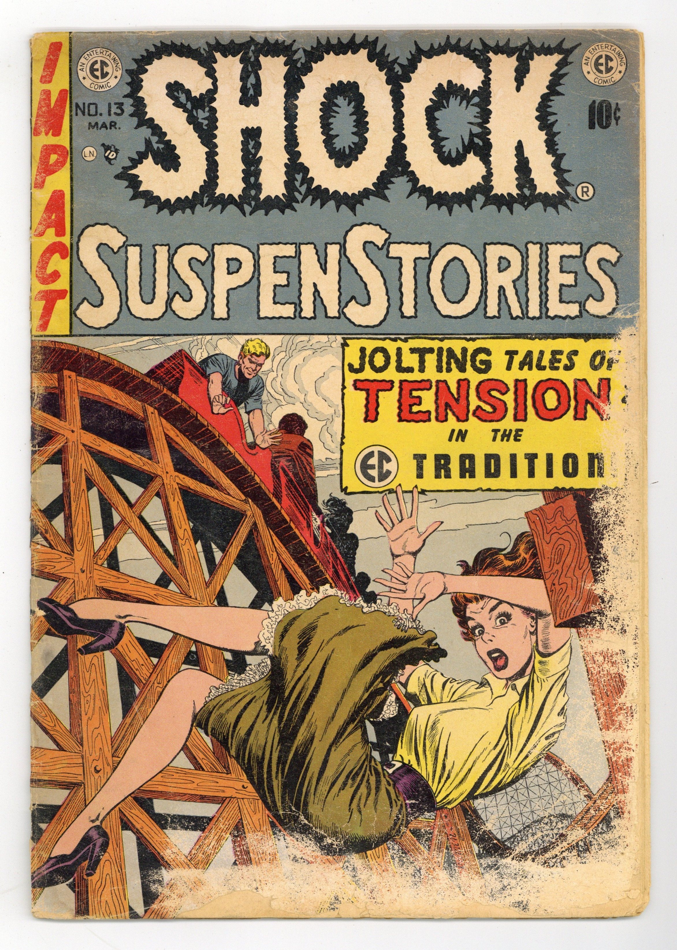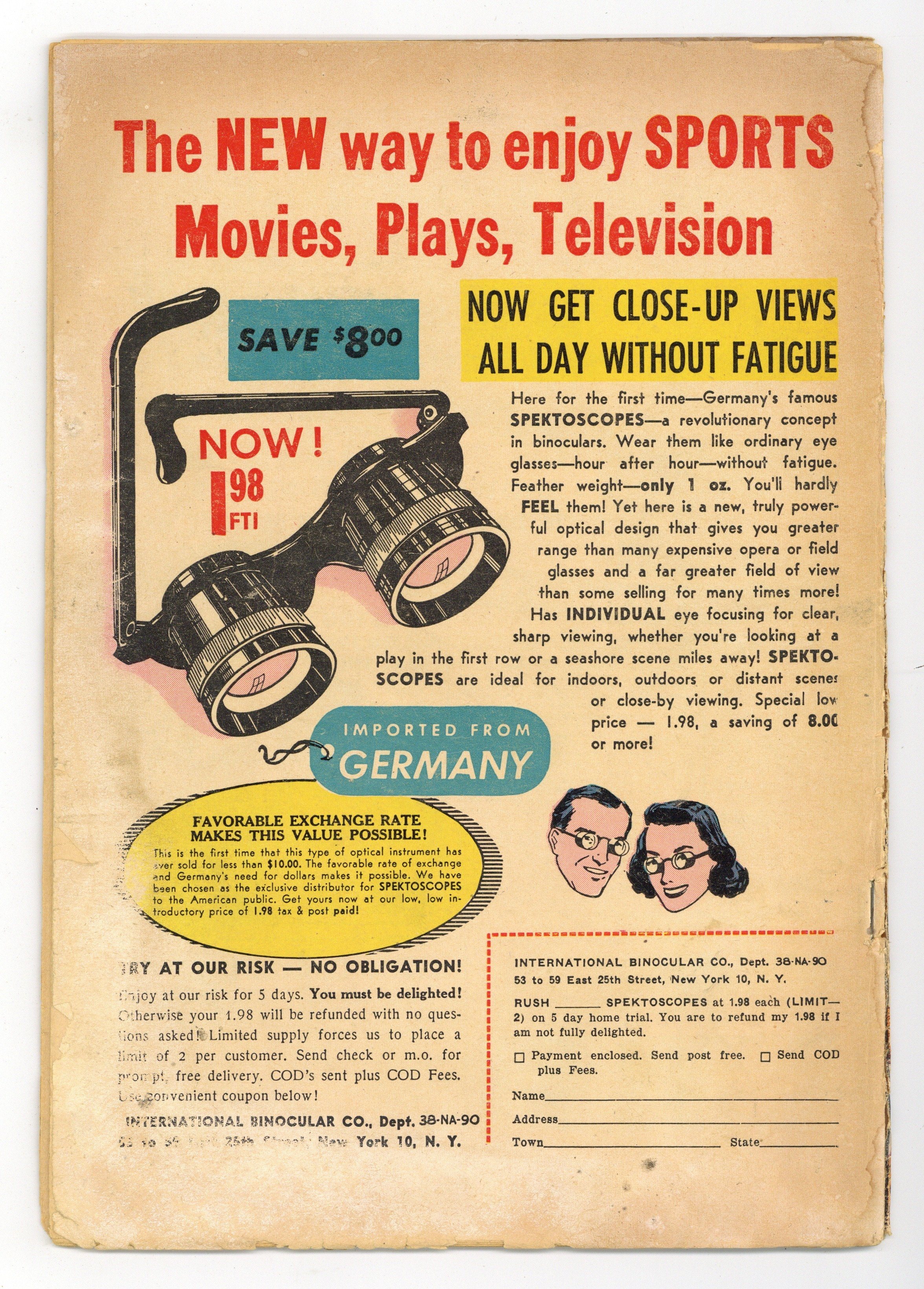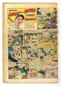 Published Aug 1952 by National Periodical Publ.$90.00- 1 1/2" cumulative spine split. Cover detached at one staple and loose at other. Water damage. Staple rust with migration.