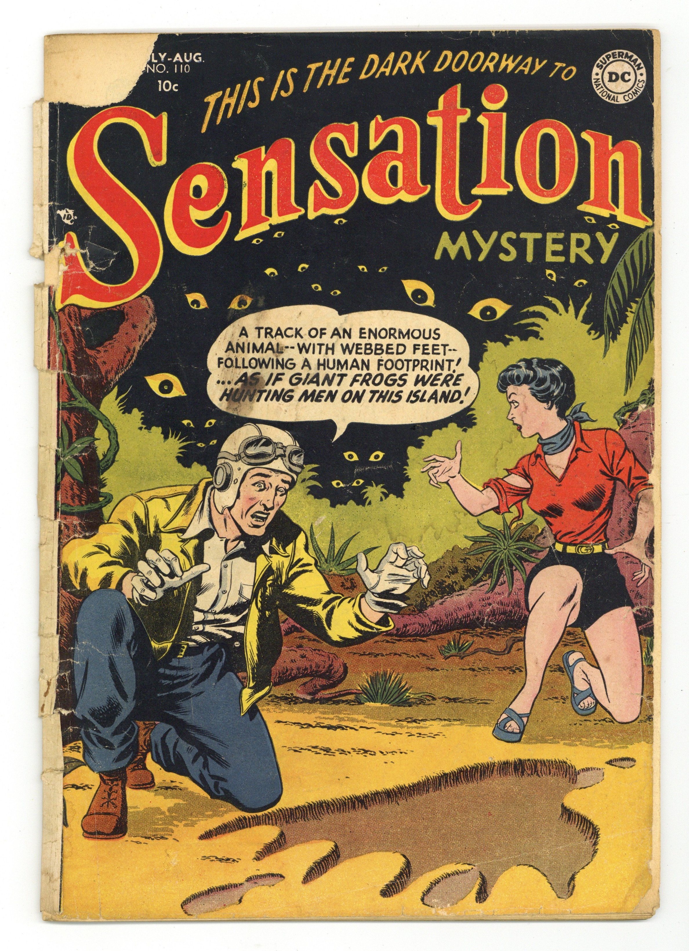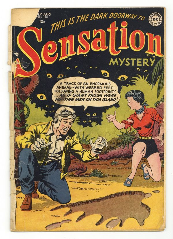 Formerly Sensation Comics. Cover pencils by Gil Kane, inks by Murphy Anderson. Nightmare Island!, pencils by Carmine Infantino, inks by Sy Barry; Test pilot Larry Mangrum pushes his plane through the speed barrier at 1500 miles-per-hour; He crash-lands in another dimension—An island populated by giant frog beings, where he meets two other missing pilots. Vengeance of the Invisible Men!, art by Murphy Anderson; Robert Marley comes into possession of magic glasses, which make him see the invisible "Trogs"; The trogs are causing deadly accidents all over the country and try to wipe out the human race. The Vampire Myth article by Jack Miller, art by Raymond Perry. Horror in the Lake!, script by Robert Kanigher, pencils by Frank Giacoia, inks by Sy Barry; Johnny Peril has to fight a horde of evil and weird caterpillar monsters. He can outrun and finally outfox them by using explosives he finds in a shack. Beware the Black Cat!, art by Morris Waldinger; Account of superstitions about black cats. 36 pgs. $0.10. Cover price $0.10.