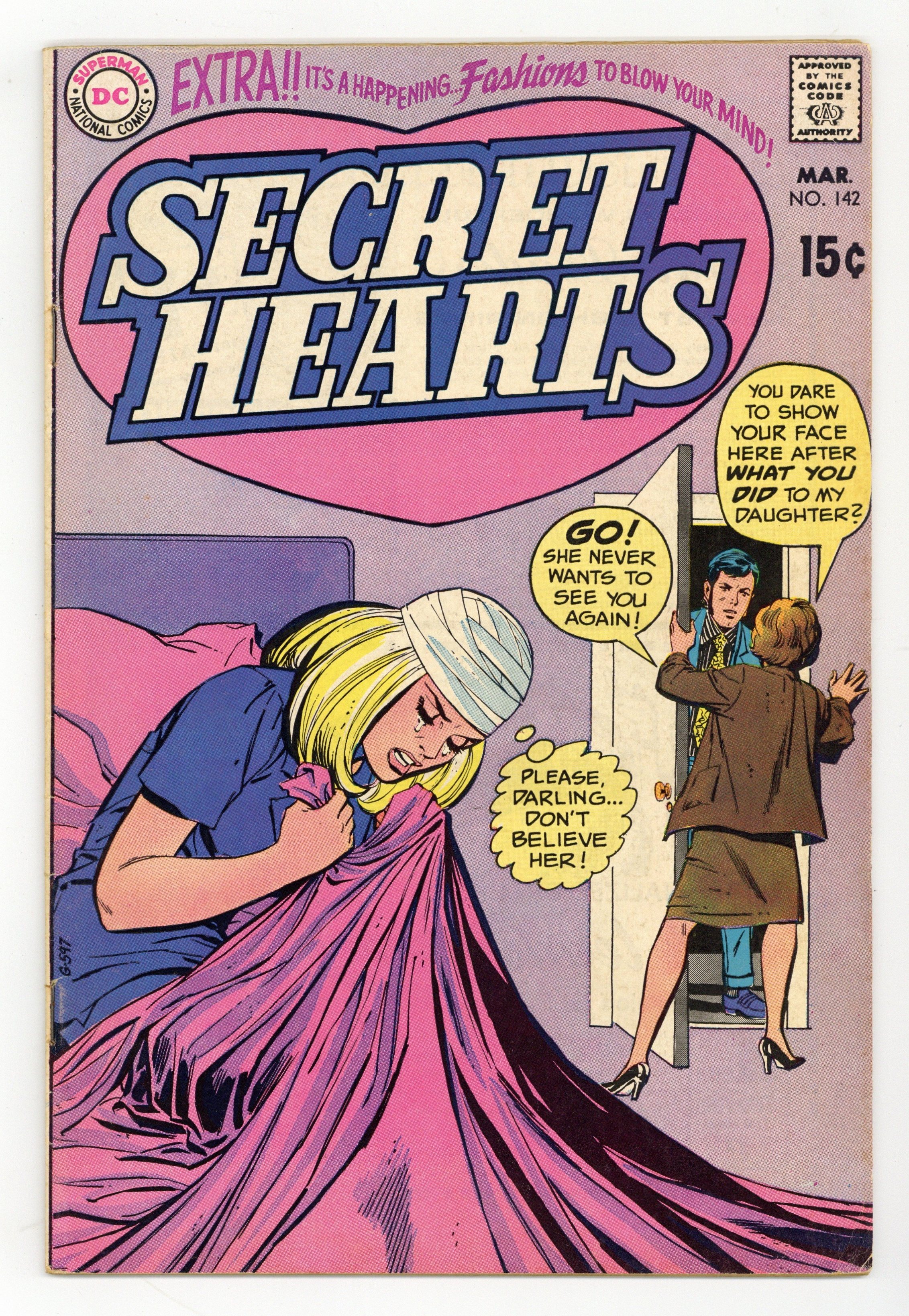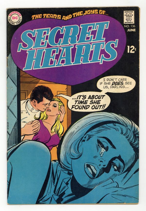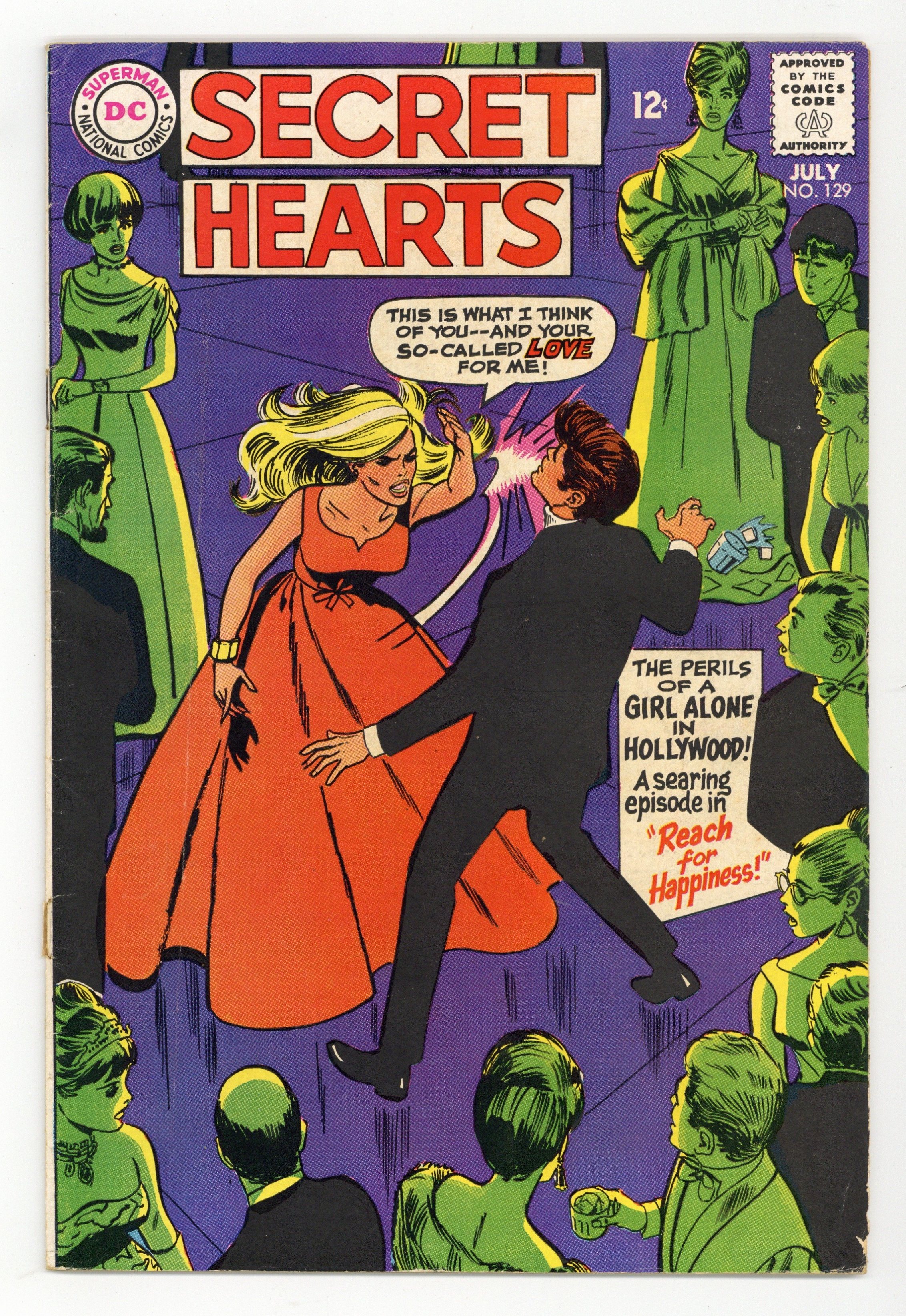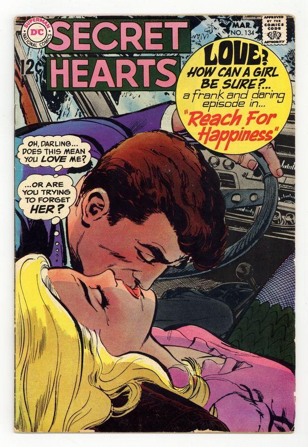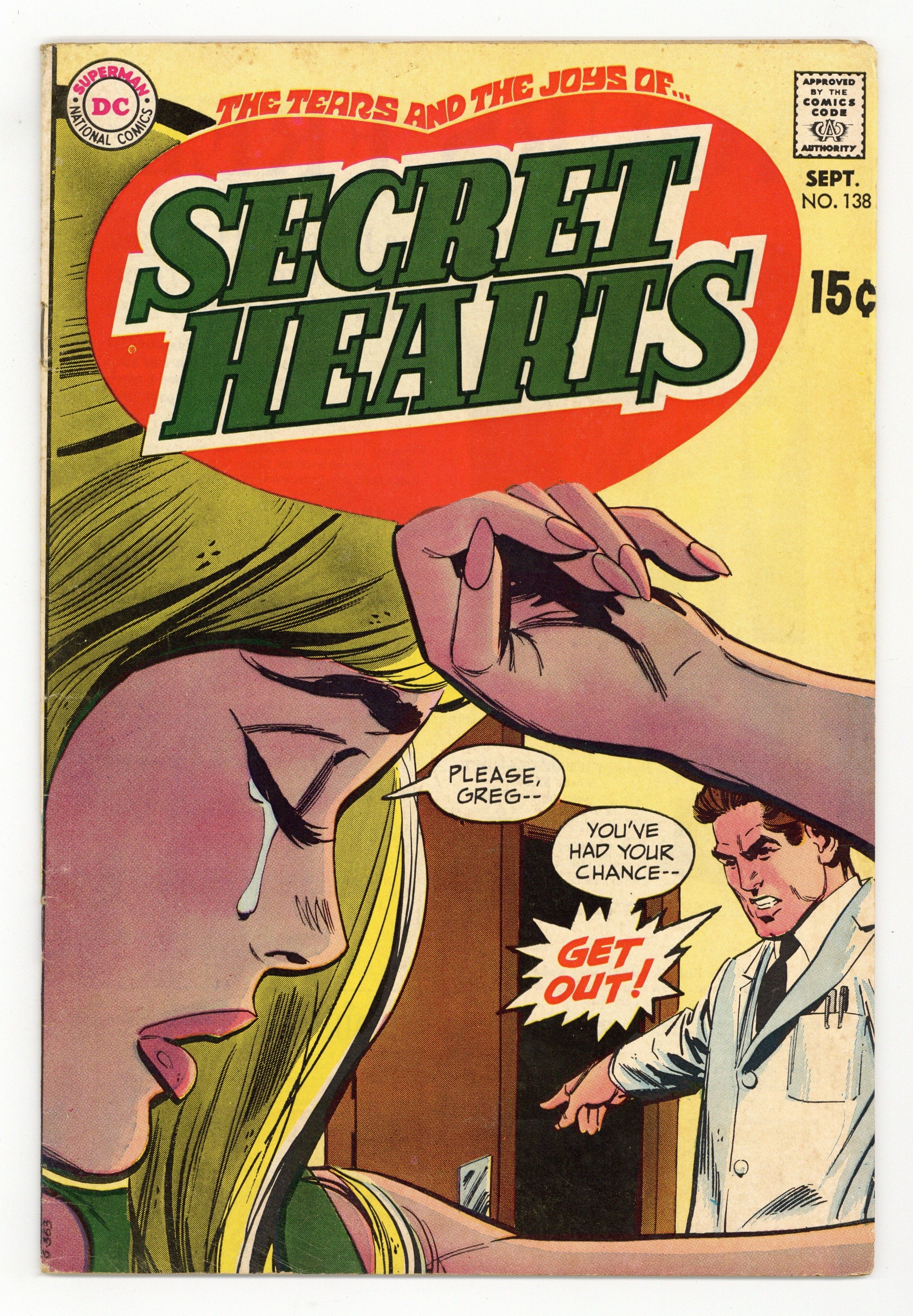 Last 12-cent issue. Cover art by Dick Giordano. Let's Pretend Kisses!, pencils by Ric Estrada, Inks by Vince Colletta; Linda needs a steady date for the summer to fit in with her circle of friends, so she enlists her neighbor Specs to pretend to be her boyfriend. Stars in My Eyes!, pencils by Mike Sekowsky, inks by Bernard Sachs; Marcie goes to Hollywood to try for stardom, but eventually she realizes that what she really wants to to marry her boyfriend Bill back home. Untitled Cindy the Salesgirl story, script by Barbara Friedlander, pencils by Win Mortimer, inks by Dick Giordano. Episode 27, script by Jack Miller, pencils by Jay Scott Pike (pp 2-15) and Dick Giordano (p 1), inks by George Roussos (pp 3-15) and Dick Giordano (p 1); When Rita comes out of her coma she realizes that she was never really in love with Greg and so she breaks their engagement; Greg immediately turns to Karen, but she is wary of his sudden transfer of affections. 36 pgs. $0.12. Cover price $0.12.