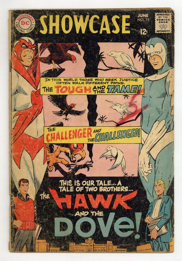 Cover art by Steve Ditko. Ad for Secret Six #2 and Brave & Bold 78. 1st appearance of the Hawk and the Dove in Prologue (Table of Contents), script by Steve Skeates and Steve Ditko, art by Steve Ditko; At Elmond University, in a small college town, pro-war and peace demonstrators face off; Caught squarely in the middle are Don and Hank Hall, brothers, a "dove" and a "hawk"; They argue about compromise, force, and rights as a riot breaks out and police rush in. Chapter 1, In the Beginning..., script by Steve Skeates (script) and Steve Ditko (plot suggestions), art by Steve Ditko; In a small college town in Elmond County...; In court, Judge Hall senteces Mr. Dargo, a racketeer, to jail; He vows "my boys" will get revenge; In chambers, Don and Hank argue about compromise vs. violence. Angel and the Ape ad. Chapter II, A Voice...a Voice..., script by Steve Ditko (plot) and Steve Skeates (script), art by Steve Ditko; Hank spots "The man who threw the bomb!"; The boys follow into an abandoned building, but are trapped. House ad for 80-Page Giant Superman #207, 30th Anniversary Issue, pencils by Curt Swan, inks by Neal Adams. Chapter III, The Birds Fly!, script by Steve Skeates (script) and Steve Ditko (plot suggestions), art by Steve Ditko; Costumed, Hawk and Dove burst in on mobsters come to kill Judge Hall in the hospital. Article in which Dick Giordano introduces himself, and The Hawk and the Dove, and the political terms, citing Viet Nam. 36 Pages, Full Color. Cover price $0.12.