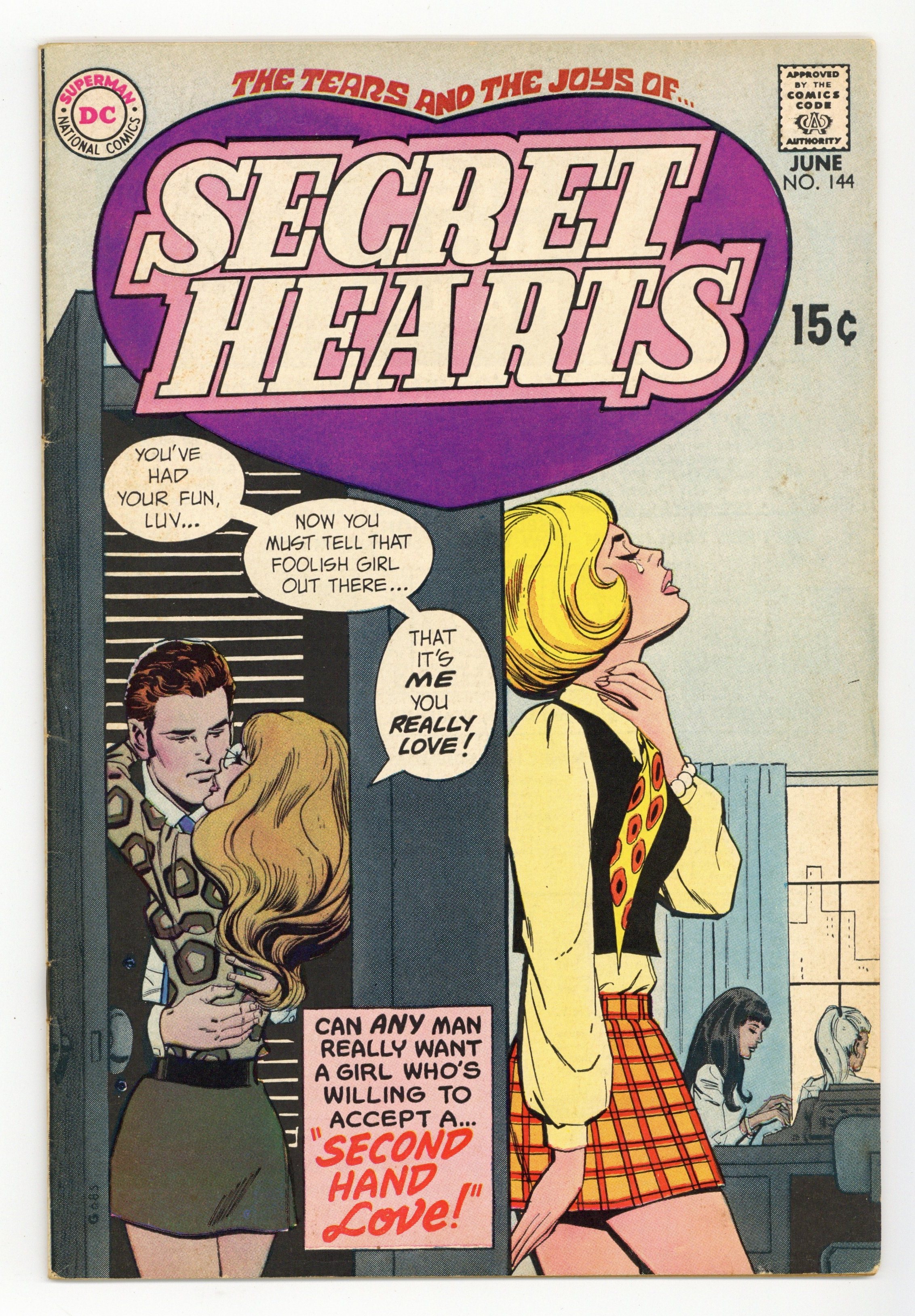 Cover pencils by Carmine Infantino, inks by Dick Giordano. How to Lose the Man You Love, art by John Rosenberger; When Liza's boyfriend Paul catches her with another guy, she reflects on their relationship and realizes that she doesn't really love Paul after all. Lonely Lovesong, pencils by Tony Abruzzo, inks by Bernard Sachs; Mary goes away on a vacation when she and Bill break up but she can't stop thinking about him; Fortunately, when she returns, he's waiting to apologize. Episode 29, pencils by Jay Scott Pike, inks by George Roussos; Karen nearly runs away again when she can't decide whether to marry Greg, but when she mistakenly believes that he has been in an accident she realizes how much she loves him; Richy and Joanie agree to wait until they have finished college to get married. Ad for Superman's Girl Friend Lois Lane #95, pencils by Curt Swan, inks by Neal Adams. 36 pgs. $0.15. Cover price $0.15.
