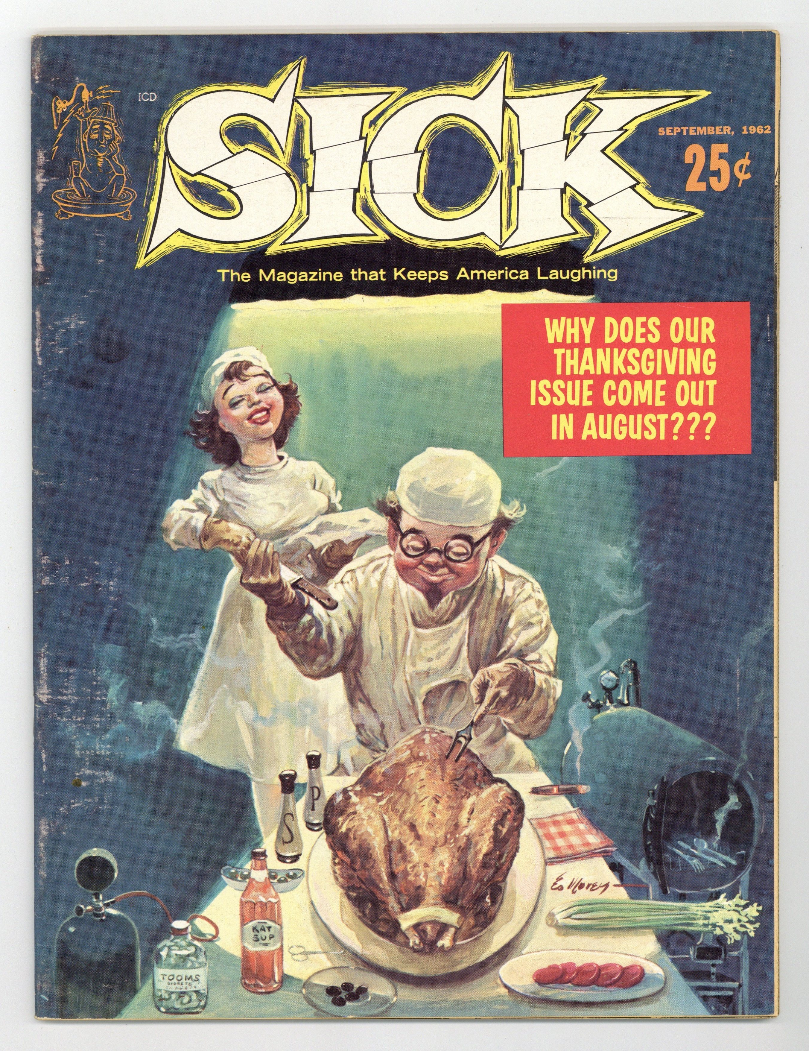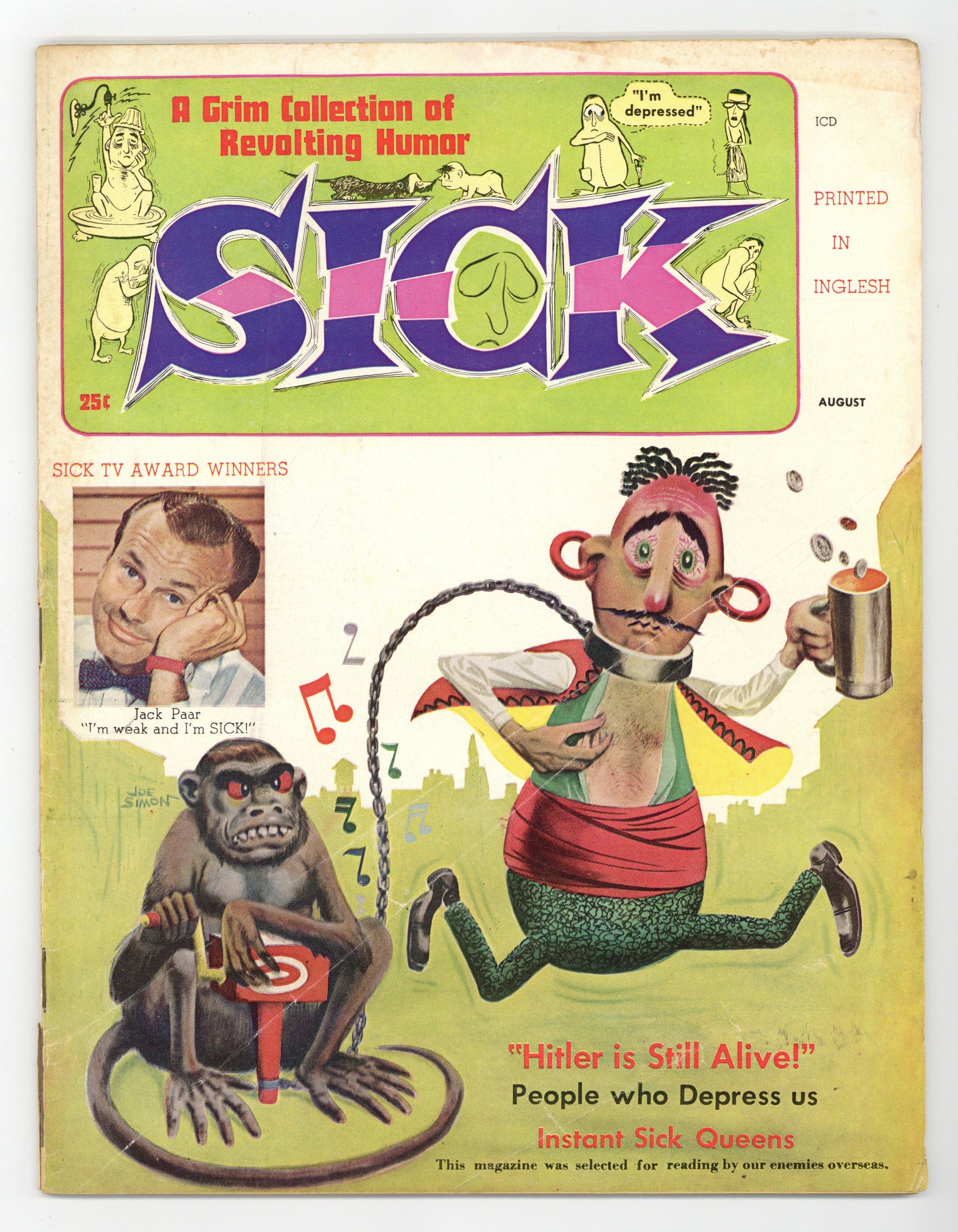 Cover by Joe Simon. Stories and art by Dee Caruso, Bill Levine, Angelo Torres, and Joe Simon. One of the more successful MAD mimics, created by comics legend Joe Simon, featuring an array of comedic talent. Crestwood/Feature was the first of several publishers. Spoofs of The Untouchables cop show and Ben-Hur. What if comedy writers wrote Lincoln's Gettysburg Address? Ad spoofs, cartoons, profiles of humor icons Jack Paar and Dean Martin, and even a fumetti (photo-comic) satirizing late-night movies on TV. The Birth of Sick; My Sick Sick World; If Certain Citizens Ran the Government; Creating New Animals by Cross Breeding; Monologue for Sick Comics; The Retouchables; Bitter For Life; Hitler Is Still Alive; History in the Making; Products of the Fertil-ized Mind; Sick Nursery Rhymes; Bin Her; Late Late Movies; Academy Awards for Other Industries; Doubleheader Award; The Hand-Wrought Jewelry of Olga Murch; Fan Magazines for Movie Monsters. 8 1/2-in. x 11-in., 48 pages, B&W. Cover price $0.25.