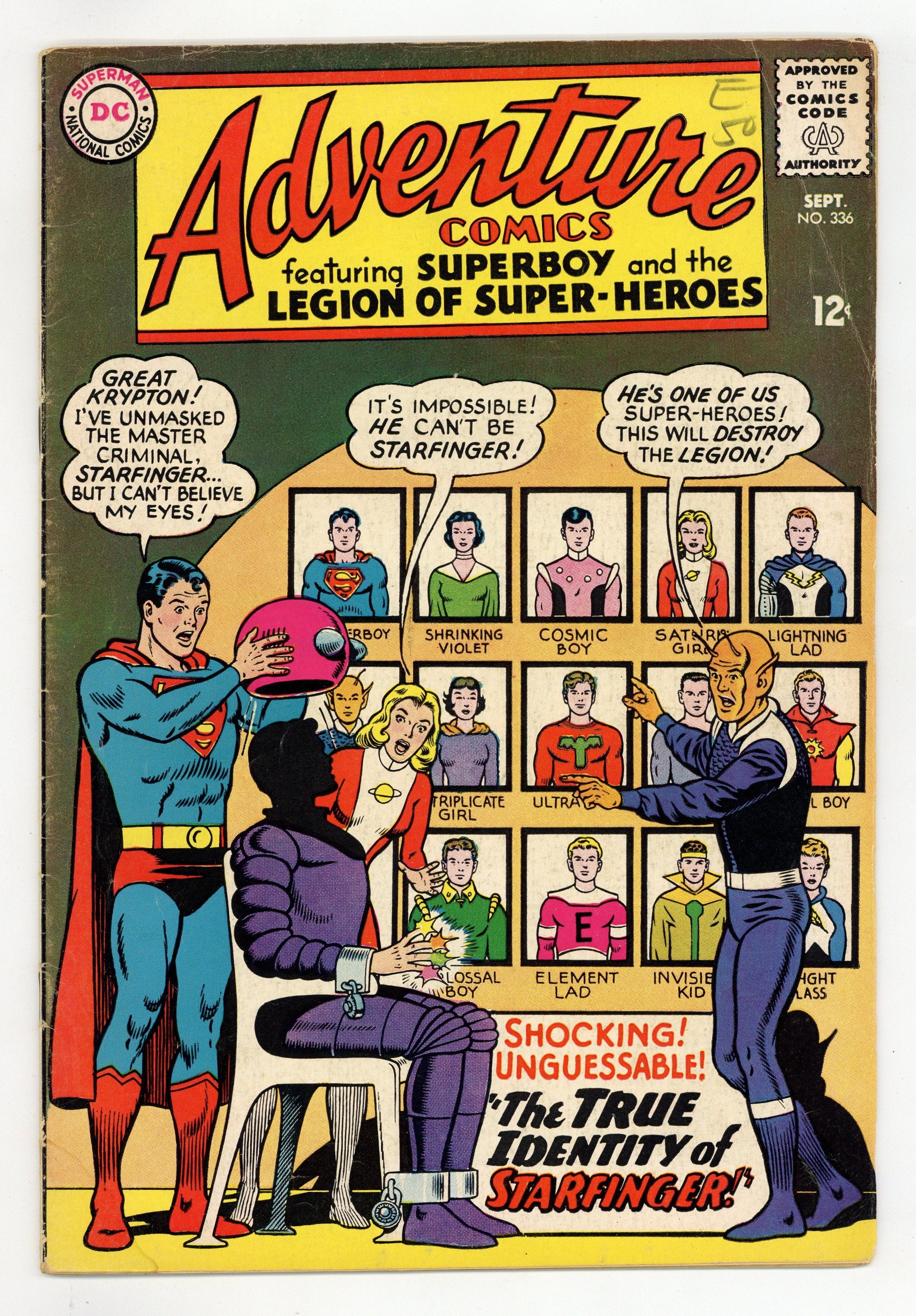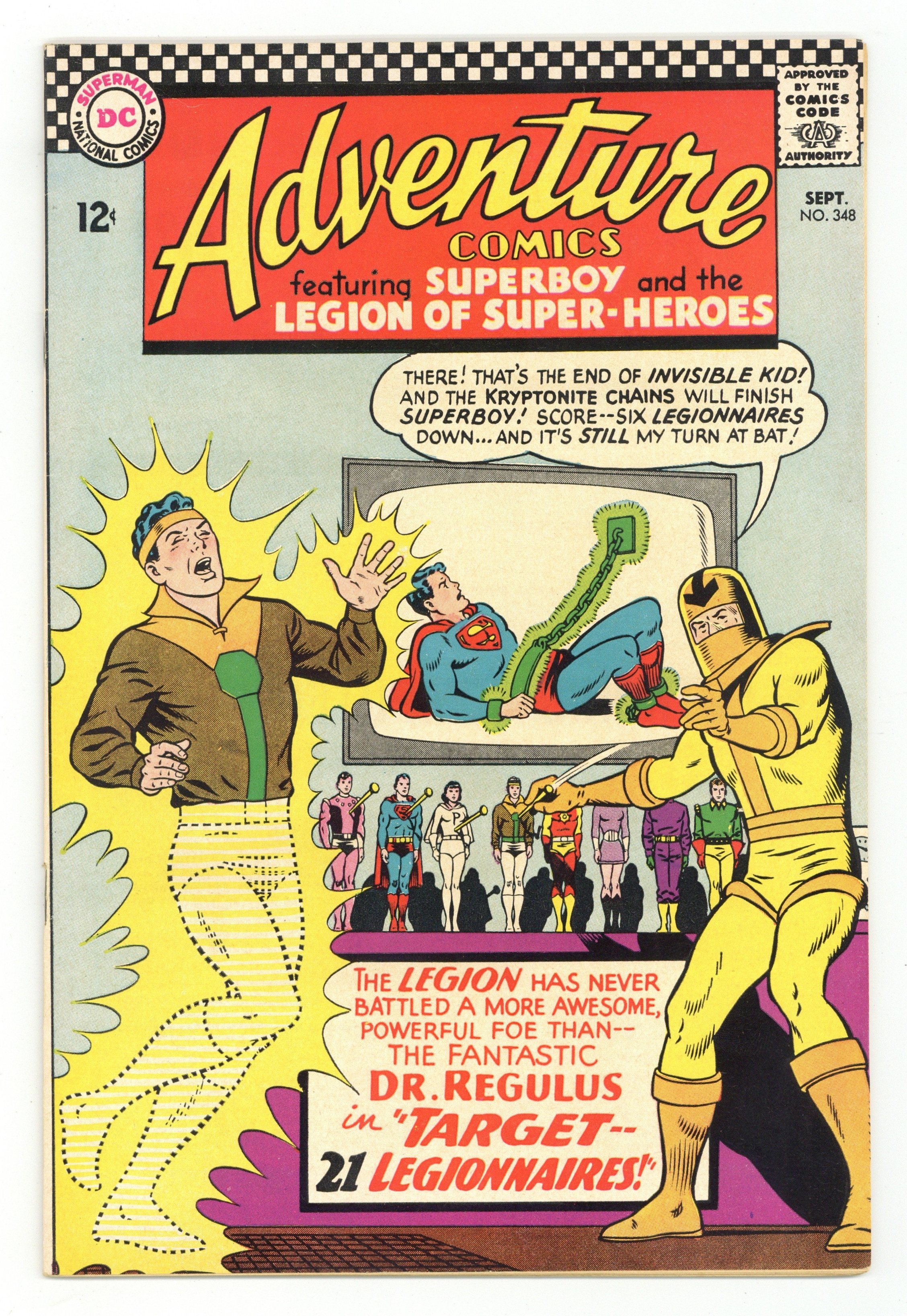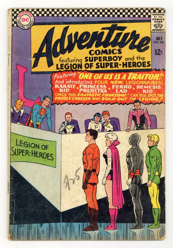 Cover pencils by Curt Swan, inks by George Klein. The Adult Legion!--Tales of the Legion of Super-Heroes, script by Jim Shooter, pencils by Jim Shooter (layouts only) and Curt Swan, inks by George Klein; Superman is summoned to help the adult Legion investigate acts of sabotage; The Legion discovers the saboteur is Ferro Lad's twin brother, but he has been under the mind control of the Legion of Super-Villains. Lightning Lad and Light Lass article. 36 Pages, Full Color. Cover price $0.12.