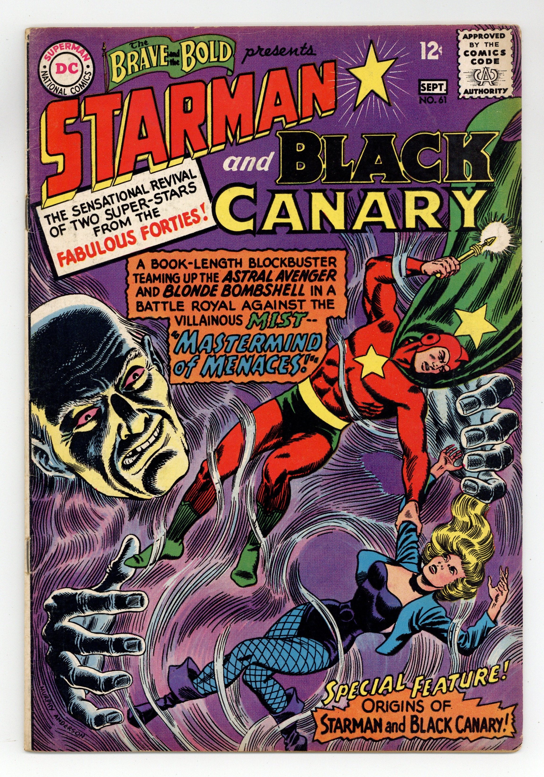 Starts Feb 9 Cover by Murphy Anderson. "Mastermind of Menaces," script by Gardner Fox, art by Murphy Anderson; The villainous Mist returns to his life of crime by using flowers from Dinah Drake's floral shop to hypnotically induce wealthy people into parting with large sums of money, and when Starman gets involved in the case, the Mist figures out a way to nullify his famed Gravity Rod. The Origin of Starman article by Julius Schwartz, art by Jack Burnley. The Origin of Black Canary article by Julius Schwartz, art by Carmine Infantino. 36 Pages, Full Color. Cover price $0.12.