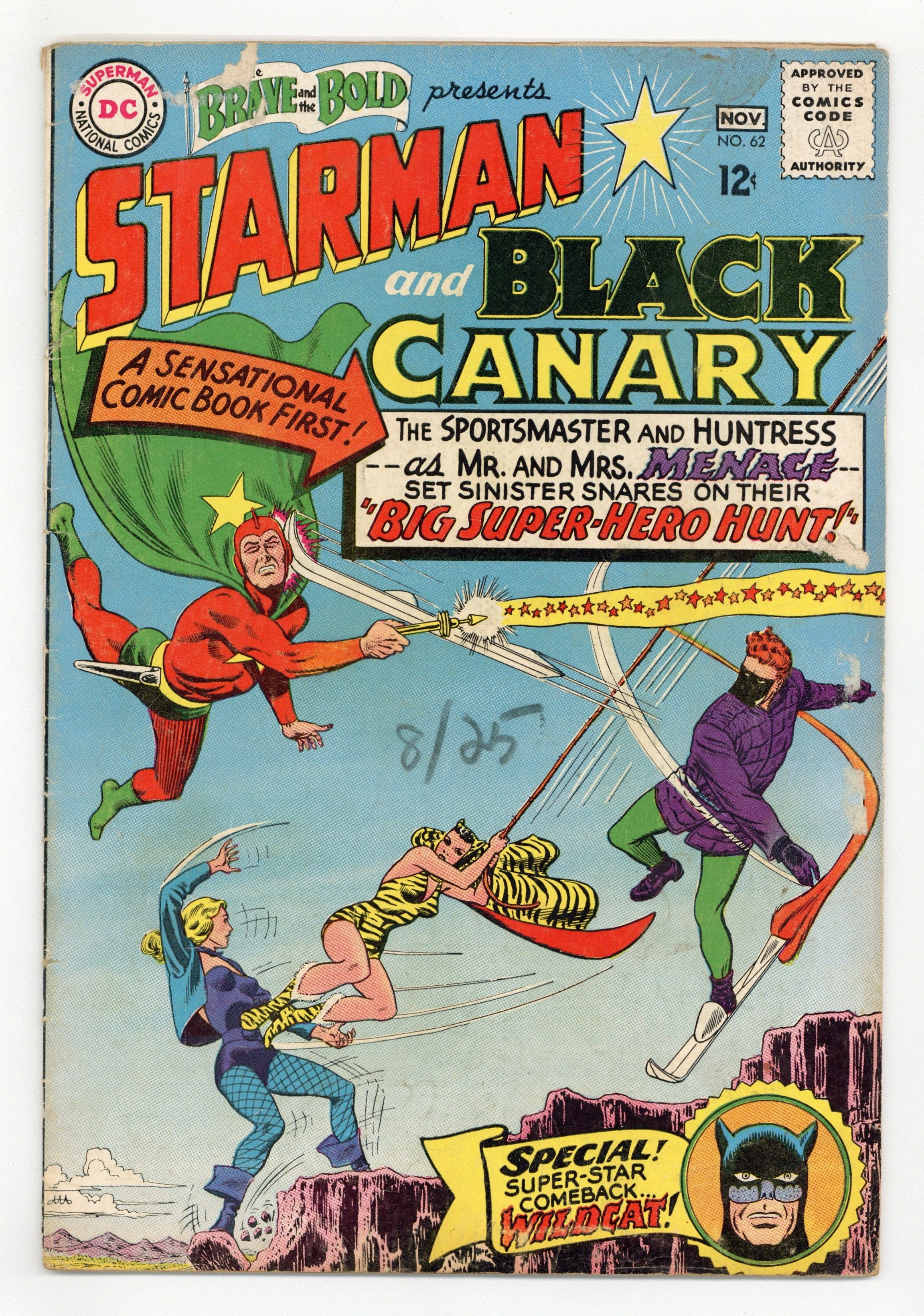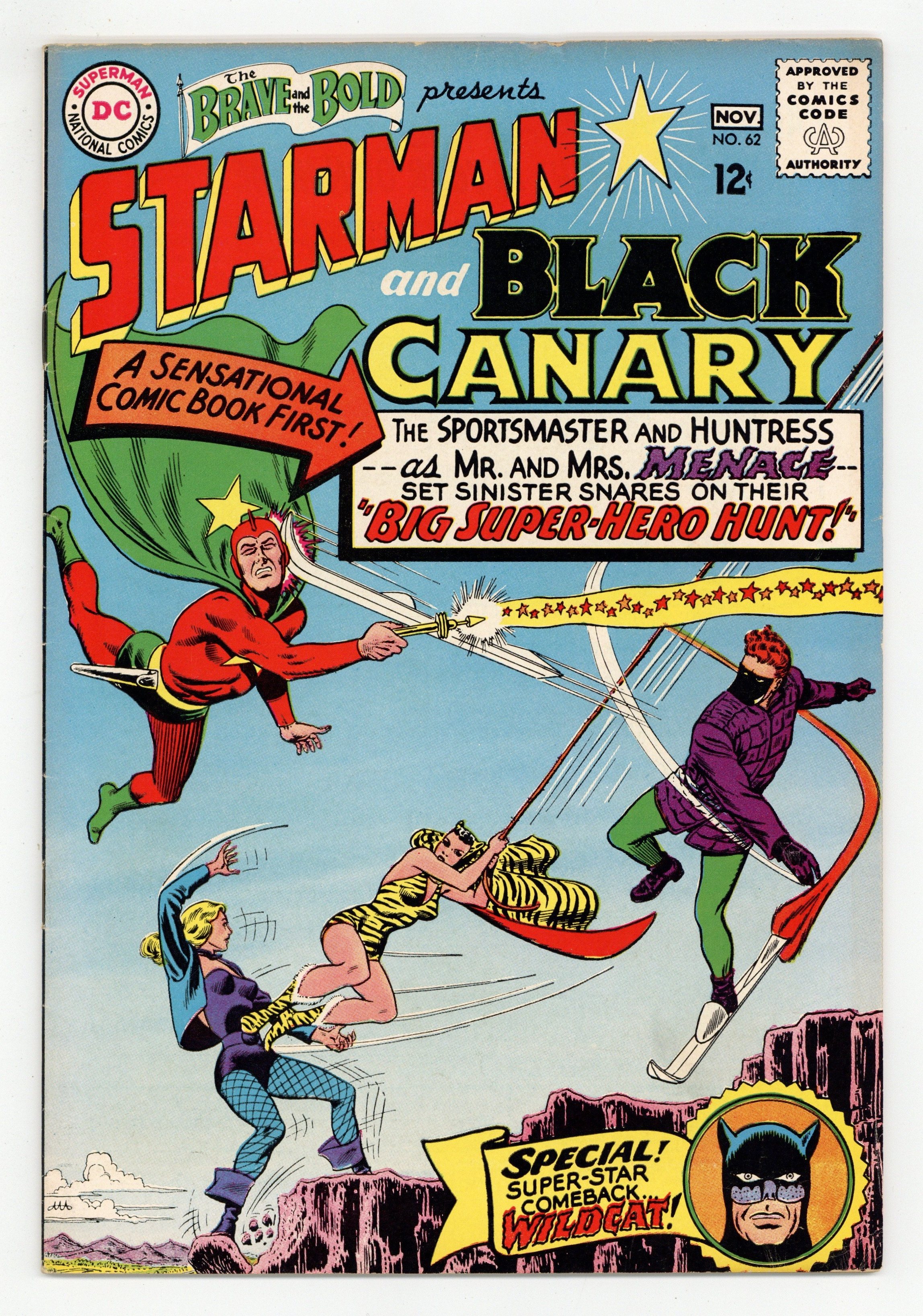Cover by Murphy Anderson. "The Big Super-Hero Hunt!", script by Gardner Fox, art by Murphy Anderson; The Sportsmaster appears on the scene and steals the famed Parker Trophy, leaving Black Canary, who, along with her men, were assigned to protect it, to get it back; At the same time, Starman discovers that Wildcat has been captured by the Huntress, and while fending off birds sent by the villainess to attack him, he learns that the crime duo are now man and wife, and are out to capture himself as well as Wildcat and Black Canary. Text page describes the origins of Wildcat, the Huntress, and Sportsmaster. 36 Pages, Full Color. Cover price $0.12.