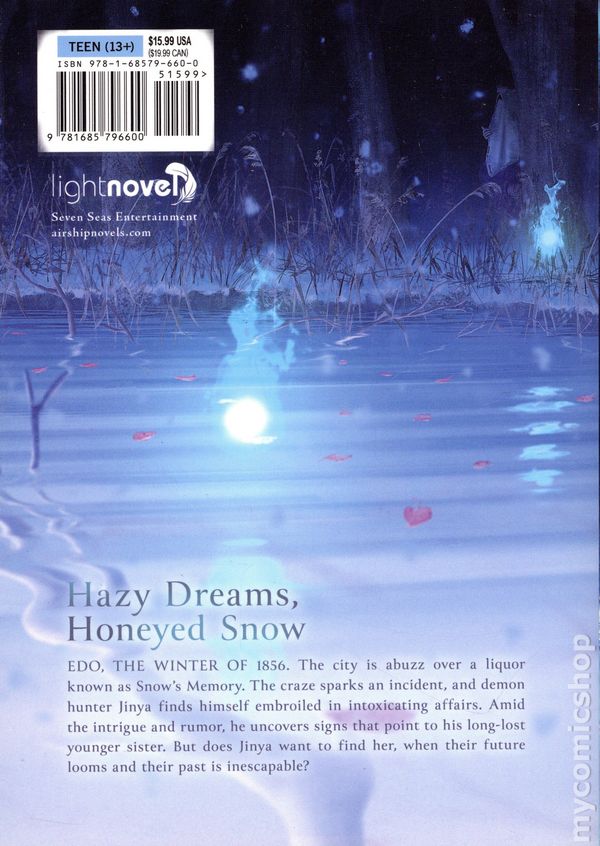 Volume 3 -1st printing. Written by Motoo Nakanishi. Translated by Kevin Ishizaka. Adapted by Athena Michaels. HAZY DREAMS, HONEYED SNOW. Edo, the winter of 1856. The city is abuzz over a liquor known as Snows Memory. The craze sparks an incident, and demon hunter Jinya finds himself embroiled in intoxicating affairs. Amid the intrigue and rumor, he uncovers signs that point to his long-lost younger sister. But does Jinya want to find her, when their future looms and their past is inescapable? Softcover, 5-in.x 7-in., 264 pages, Text (with B&W Chapter Illustrations). Mature Readers Cover price $15.99.