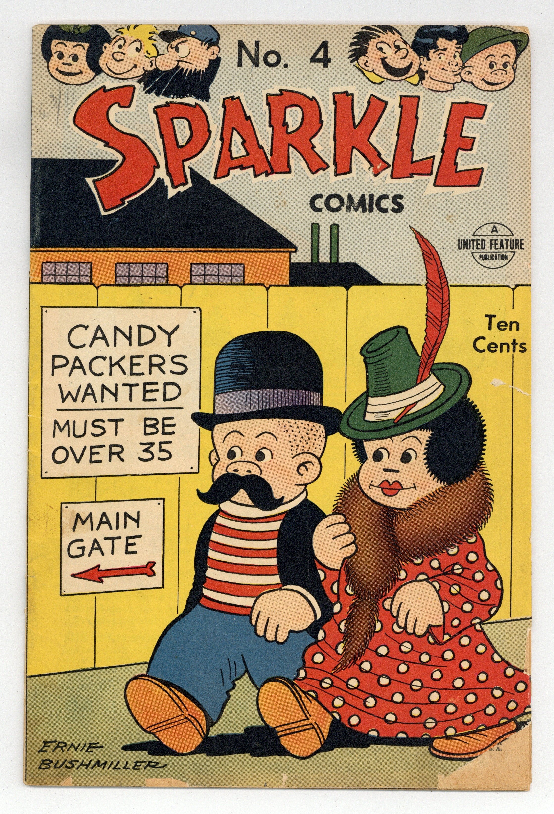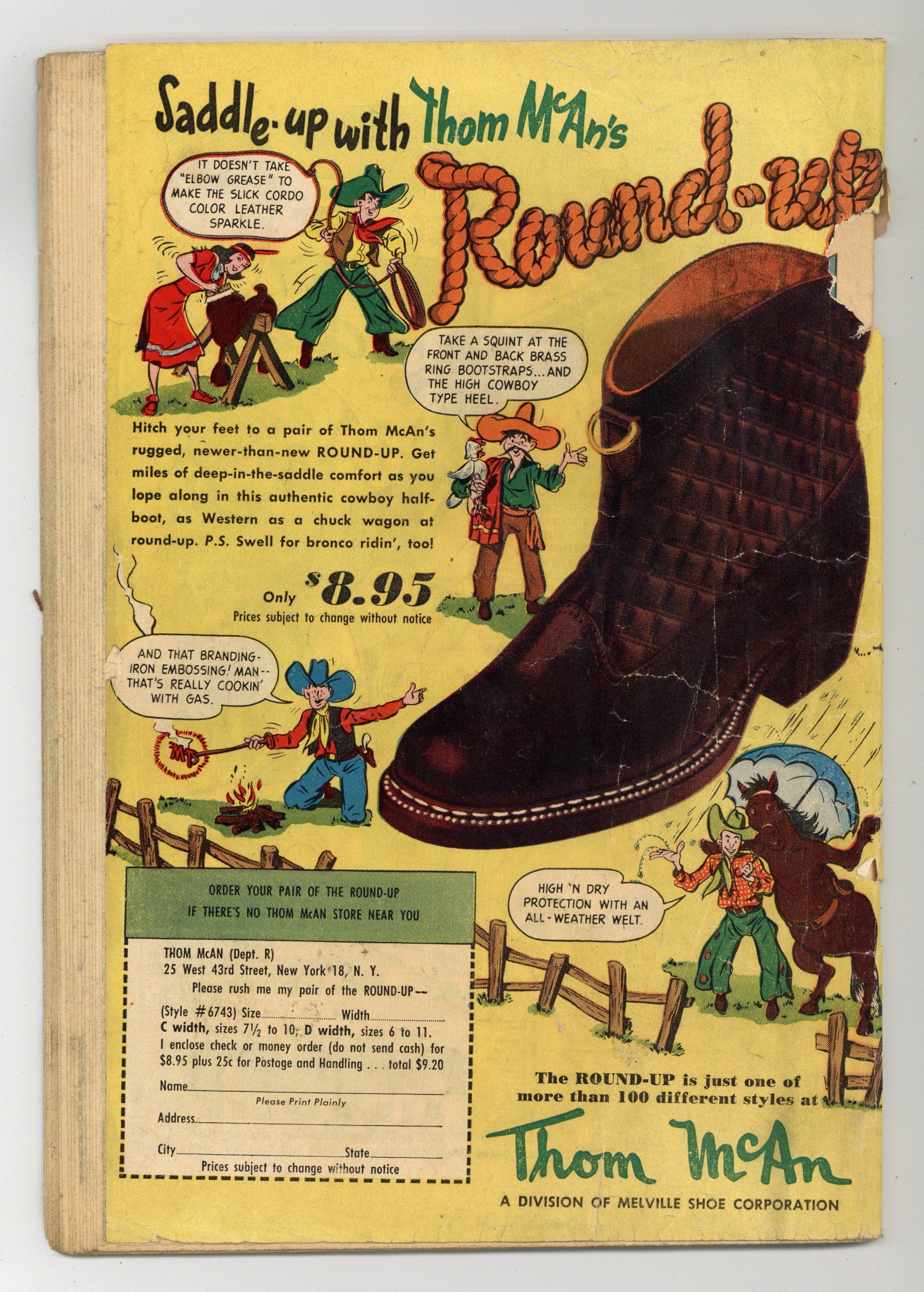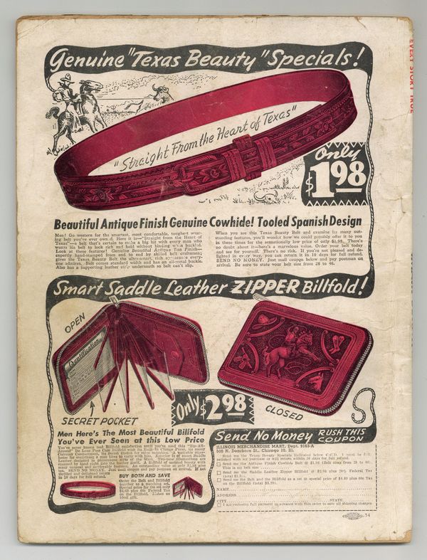 Stories and art by Louis Zansky and others. A showcase for popular Western heroes and movie cowboys. Sheriff Hopalong Cassidy takes a vacation from Twin Rivers, only to find he must deal justice with his fists in a boxing ring. Smiley Burnette must find a missing man and claim the reward before 6PM, or the printing press for the Burnette Bugle will be repossessed. "Undercover Marshal" Rocky Lane steals rifles from renegade Natives, but when they are pursued, the only escape is a Butch Cassidy-style cliff jump. Ten-Gallon Tex; Hopalong Cassidy: The Knockout; Bluster and Fluster: Farm Foes; Smiley Burnette: The Rock Head Territory Swindle; Night Rustlers; Rocky Lane: The Illegal Cargo; Windy: Lamebrain Lem. 32 pages, Full Color. Cover price $0.10.