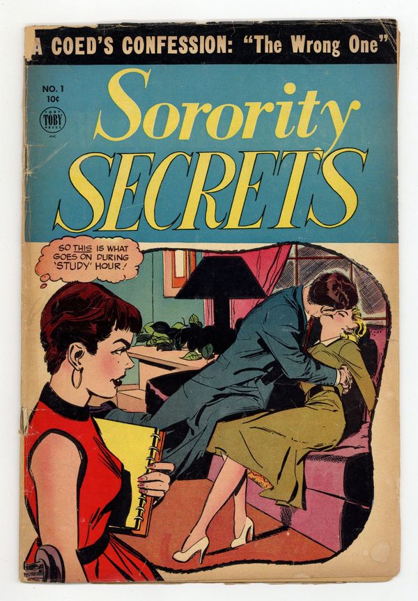 "The Secret!"; Rich and spoiled college girl Marcia Bascomb has been grounded by her young, substitute sorority housemother Scotty until her schoolwork improves; When Marcia discovers Scotty and her fiance petting in the housemother's room, she vengefully threatens to expose Scotty's apparent moral lapse to the college authorities; With Scotty at her mercy, Marcia defiantly breaks curfew and, with a laugh, dares Scotty to report her. "To Win Your Love," pencils by Bob Forgione, inks by Jack Abel; Suzanne and Warren are outstanding Westover College swimmers; Their romance is frustrated by Suzanne's competence, spirit, and pride however, and Warren's notions about traditional gender roles. "The Wrong One," art by David Gantz; Lois Mason attends her mother's alma mater and reluctantly joins her mother's beloved sorority; Much has changed since Mrs. Mason's participation and, unknown to her, the sorority has become a snobbish, controlling clique; When Lois dates Hank (one of the sorority's 'wrong ones'), the housemother threatens to write to Mrs. Mason. "The Faint Heart," pencils by Ben Brown, inks by David Gantz; Bess accepts a bet from Greta to wrangle a kiss from bashful, handsome Paul; To that end, Bess maneuvers her way into his company and the two begin casually seeing one another. "Kid Sister"; Marsha Cooper meets and dates Ralph Munson, a stranger in town looking for a job; Marsha's glamorous sister Eve captures Ralph's interest and the two begin dating. 36 pgs., full color. Cover price $0.10.