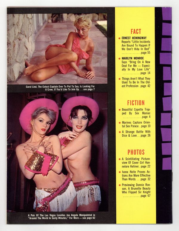 Vol. 2, No. 10. Adult magazine featuring pin-ups, articles, art, humor, and other essays. 3 page Marilyn Monroe interview. 8" x 11", 68 pages, B&W. Cover price $0.50.