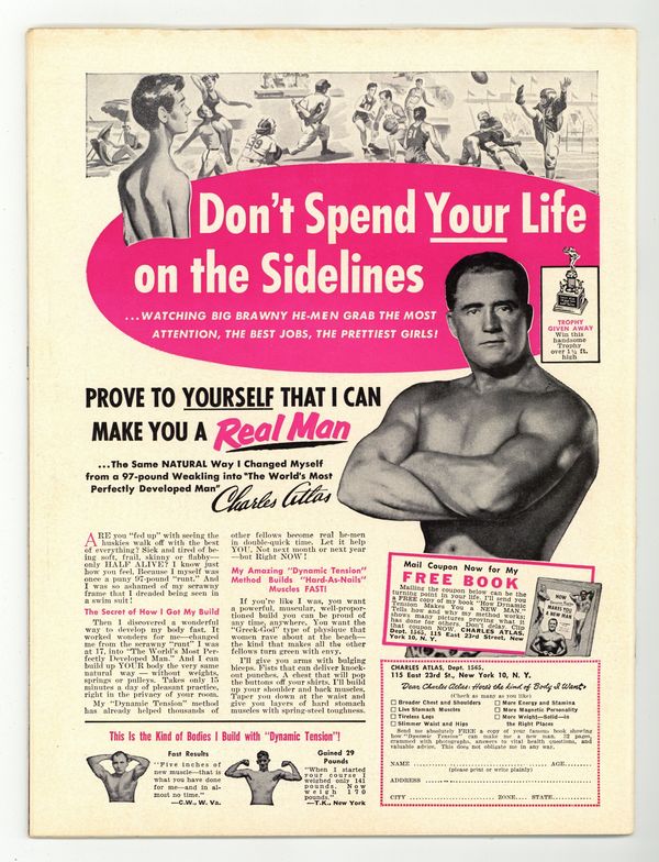 Painted cover by Allen Anderson. Stories and art by Syd Shores, Chu F. Hing, Mike Sekowsky, and John Severin. Profiles of famous athletes from early Marvel Comics, when it was still called Atlas. Knute Rockne is considered one of the greatest coaches in college football history, and the inspiration for one of the first great sports movies. Pitcher Pete Sims becomes one of the few who can claim a batting average of 1.000; A comics biography of Terry Barker, illustrated by Marvel and EC legend John Severin. Terrific painted cover by Allen Anderson. Knute Rockne, The Bald Eagle of Notre Dame; Benson Carries the Ball; They Called Him a Coward!; Battler Bastoni, The Man Who Could Have Been Champ; The Story of Pete Sims…The Grandstand Player! Final issue under this title; the series continued as Sports Action (1950) #2. 48 pages, Full Color. Cover price $0.10.