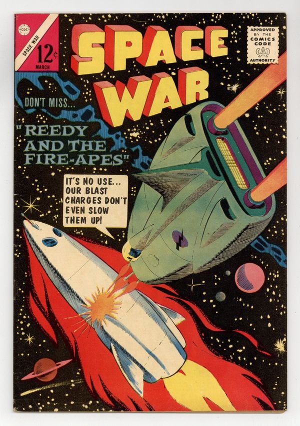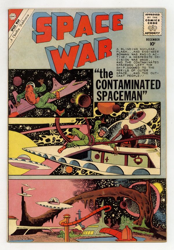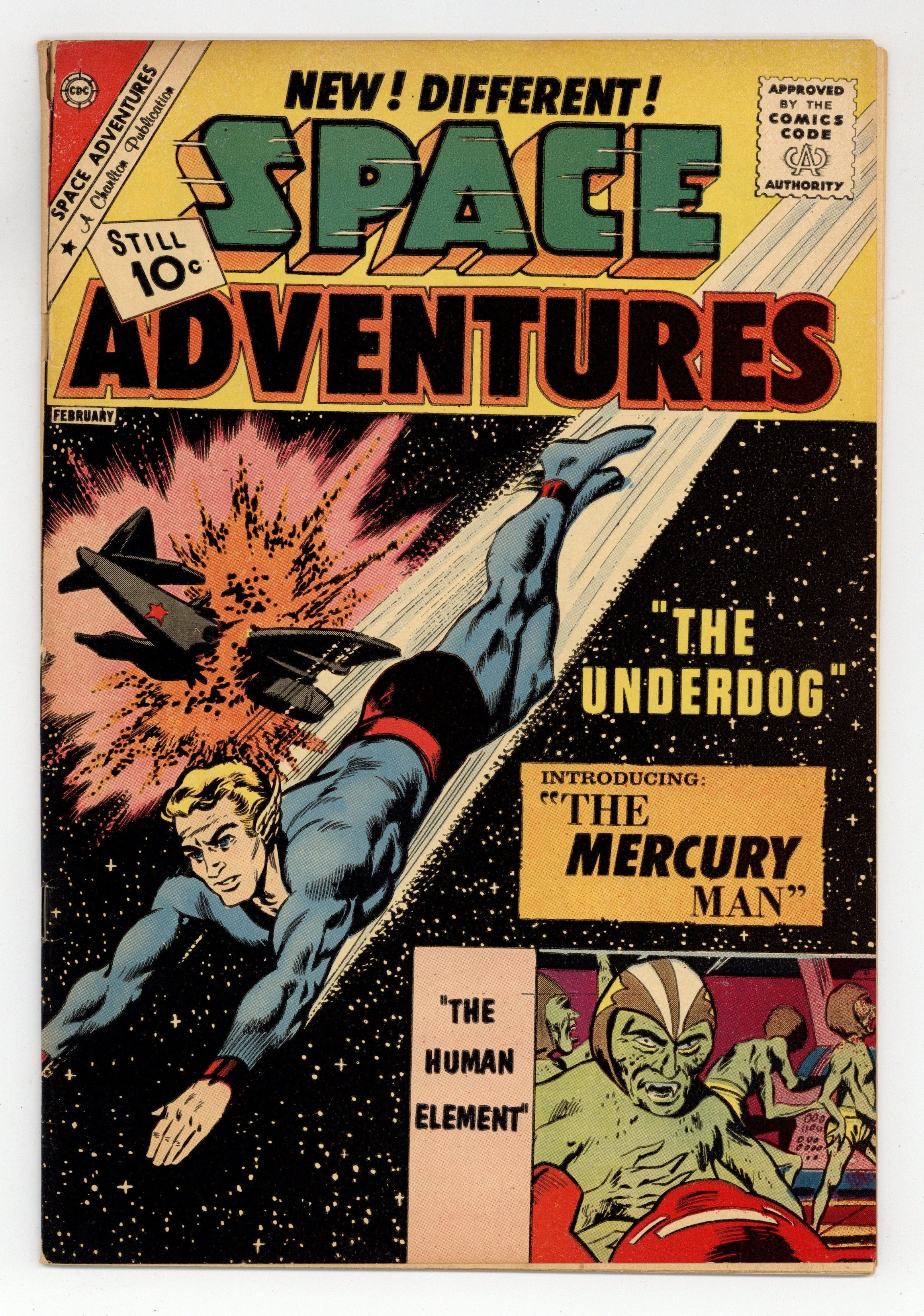Cover by Rocco "Rocke" Mastroserio and Vince Alascia. Stories and art by Bill Molno, Vince Alascia, Charles Nicholas, Sal Trapani, Rocco "Rocke" Mastroserio and Joe Gill. Sci-fi and super-heroics from Charlton Comics. Veterans of a centuries-long space war learn the truth about the alien race that humanity has been fighting all these years. Future astronauts encounter a disabled ship and its alien pilot, who looks like a beautiful human woman. Scientist Dr. Erika Penn learns that the mysterious force preventing wars on Earth is Mercury Man, last survivor of the planet Mercury and Earth's newest superhero. The Underdog; The Human Element; Magic Skates; Introducing: The Mercury Man!; Make Mine Moonport. 32 pages, Full Color. Cover price $0.10.