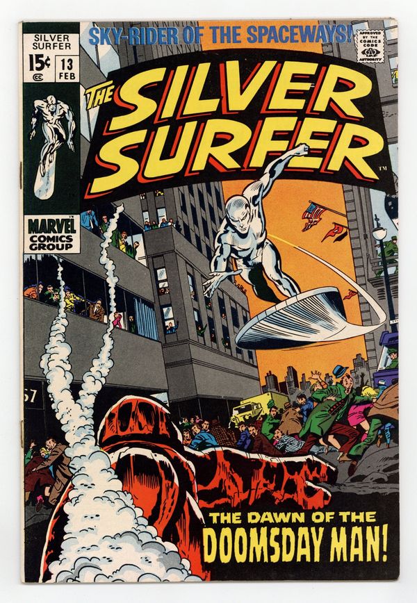 "The Dawn of the Doomsday Man!" Written by Stan Lee. Art by John Buscema and Dan Adkins. The ground rumbles and the citizens of New York City tremble in fear as the monstrosity known as the Doomsday Man rise from the bowels of the earth. Only the Silver Surfer, a being whom the people of Earth have ridiculed and alienated time and again, can save them now. Cover price $0.15.