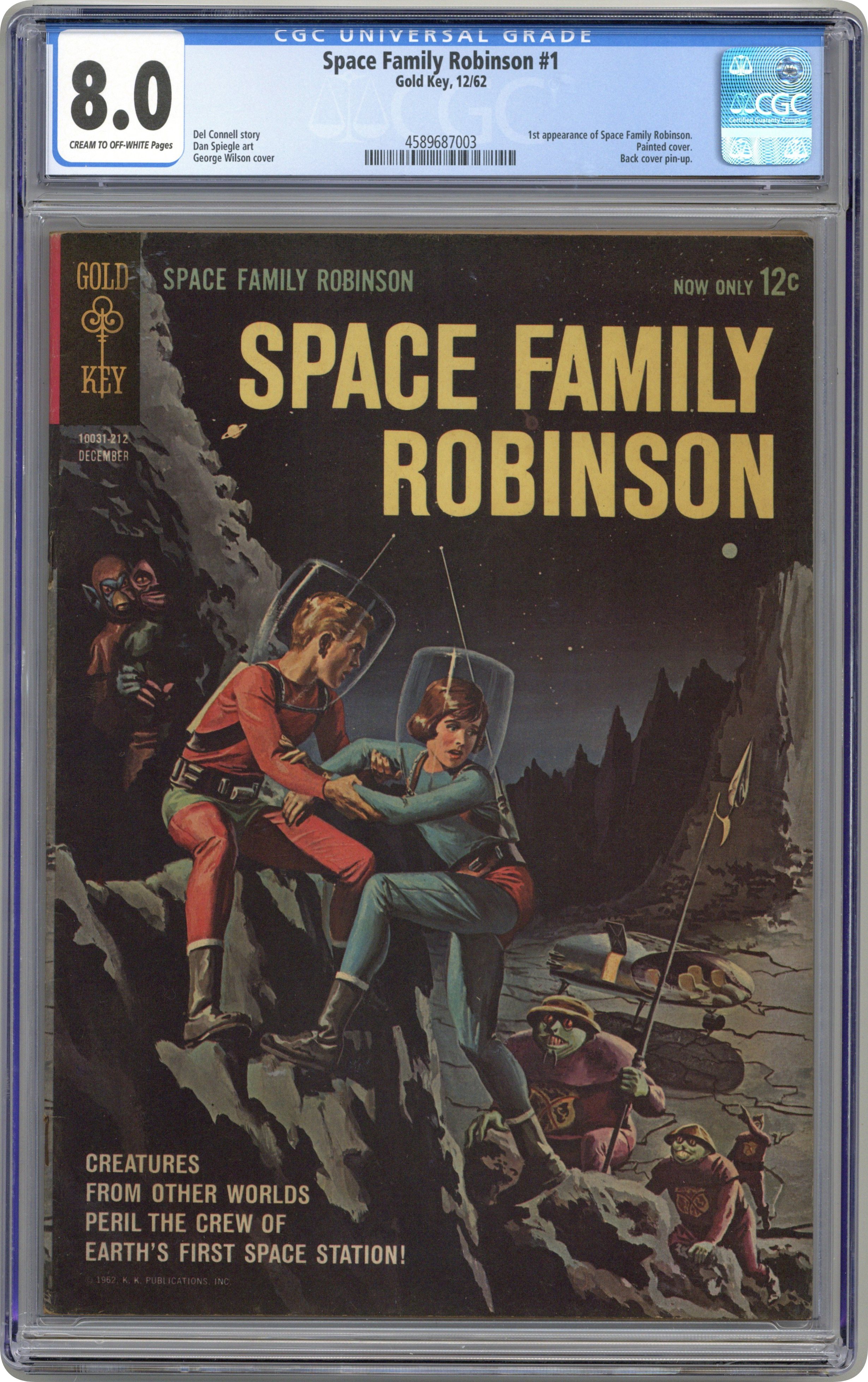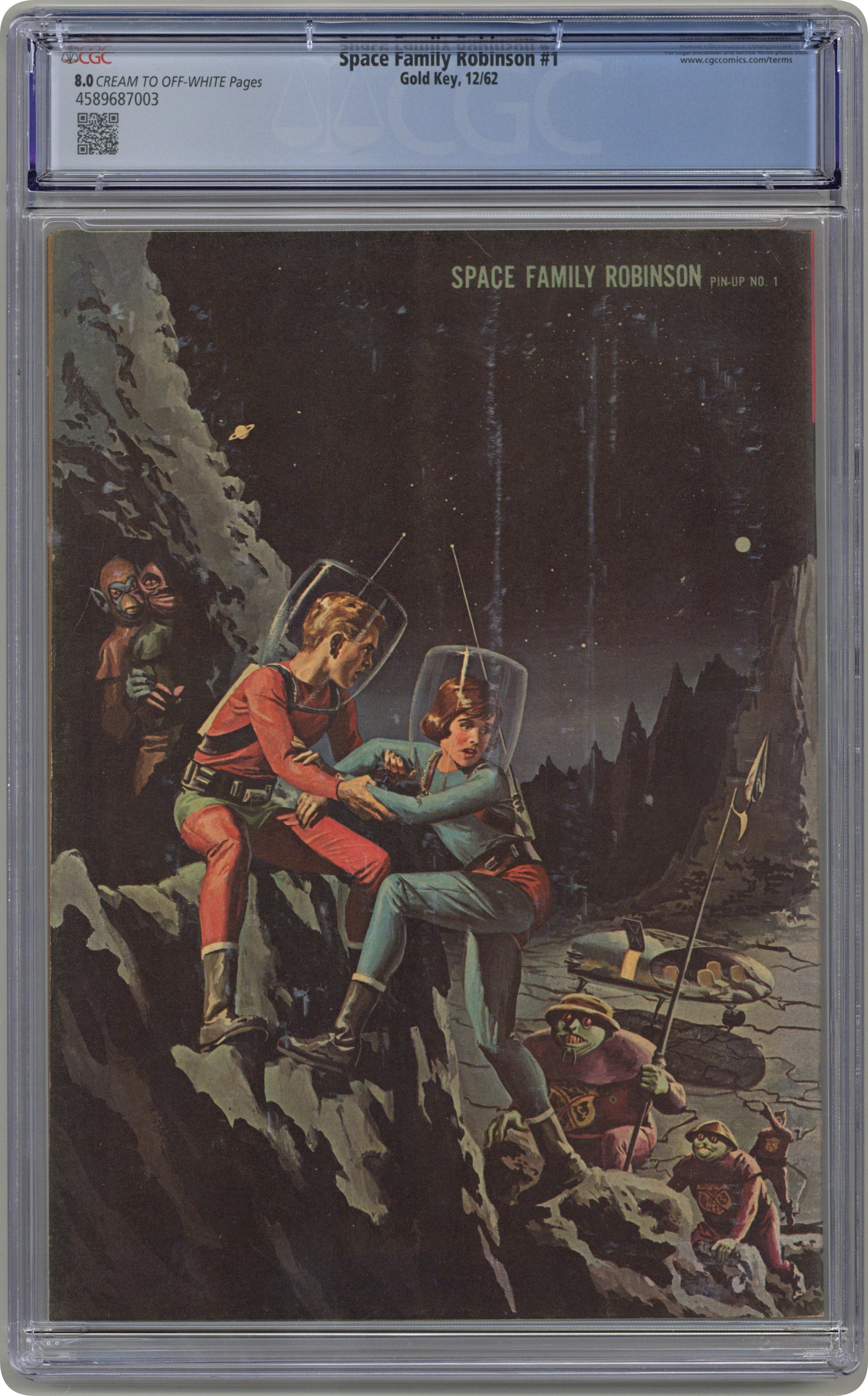 #10031-212 on cover. The first issue of Space Family Robinson was distributed in low quantities. Painted cover art by George Wilson. "The Challenge of Gorko," script by Del Connell, art by Dan Spiegle; After a threat to their space station home by a shower of fiery meteors, the Robinsons intercept a radio message for help from a planet threatened by someone named Gorko and his renegade outcasts from other planets, and they all agree to provide whatever assistance they can. "Rescue on Asteroid 48," script by Del Connell, art by Dan Spiegle; Tim and Tam locate a missing spaceprobe rocketship and crew from the Earth on an asteroid inhabited by a race of creatures known as the Clay Men. Depiction of many of the constellations in the universe, such as Orion, Taurus, Puppis, Cancer, Gemini, Canis Major and many others. Space Family Robinson Pin-Up No. 1painted by George Wilson. 36 pgs., full color. Cover price $0.12.