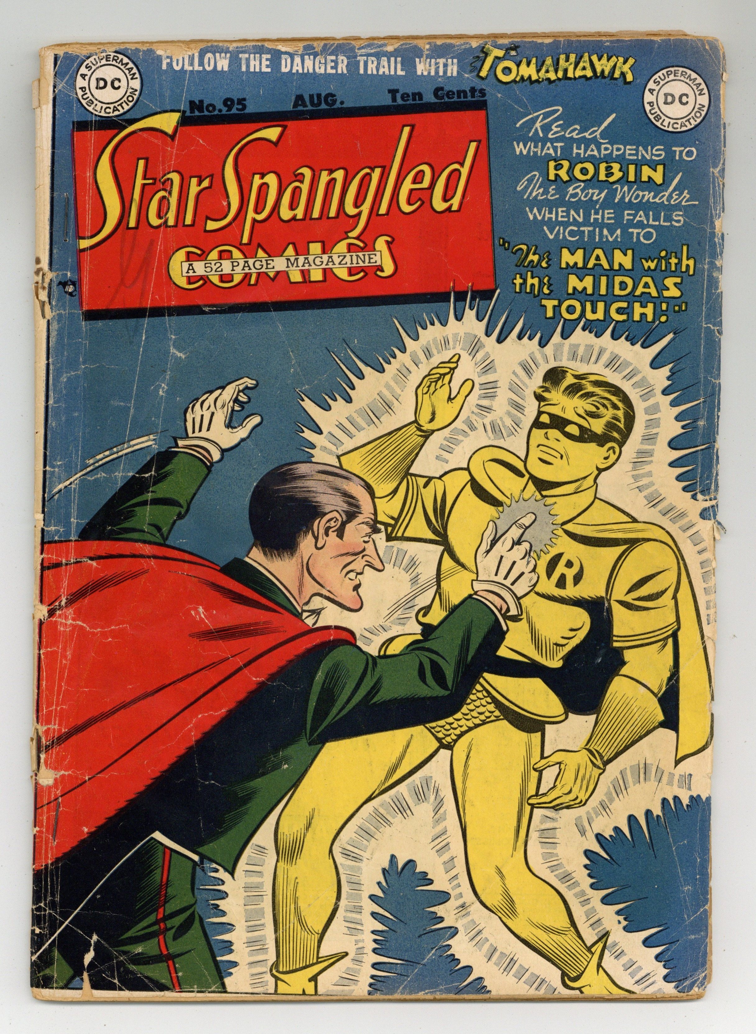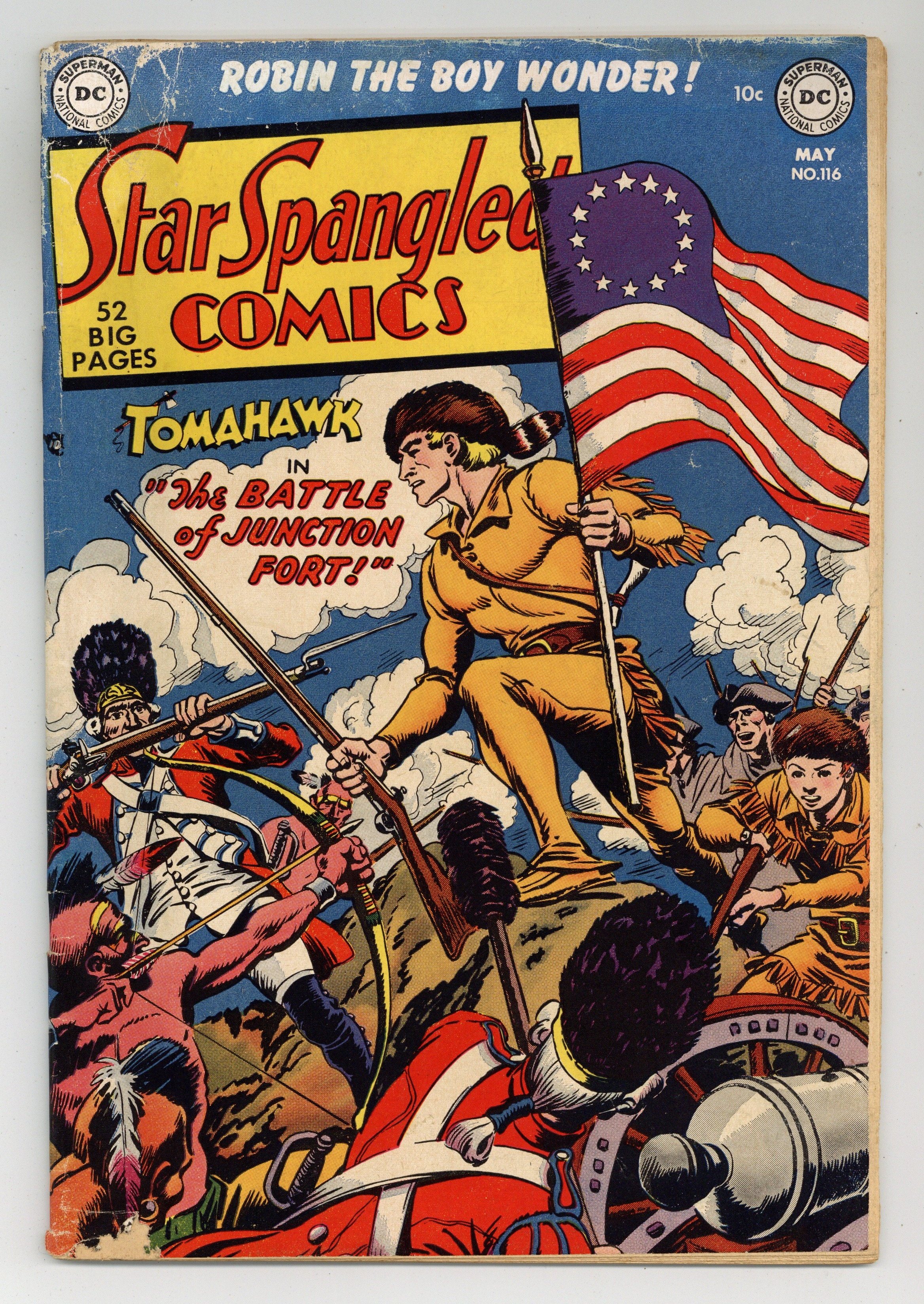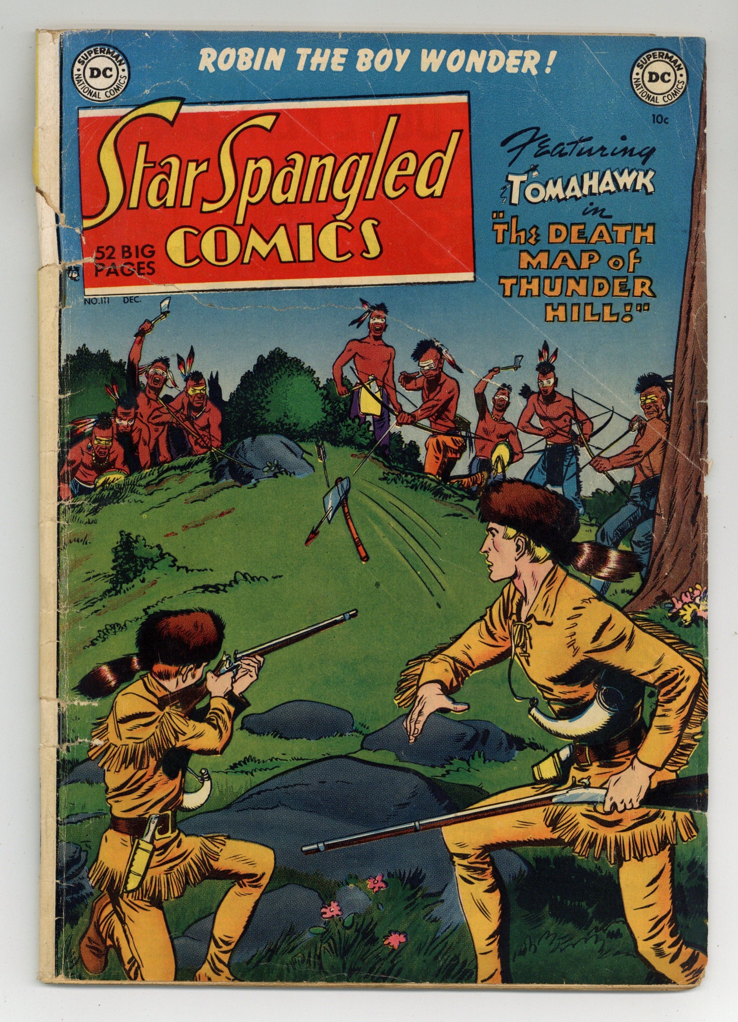 Tomahawk in "The Battle of Junction Fort," Captain Compass in "The Painter of Doom," Manhunters Around the World in "The Currency Cops" (pencils by Curt Swan?), and Robin in "The Man No One Could Kill!" One-page Handy Andy (art by Jack Farr?). Fred Ray cover. Cover price $0.10.