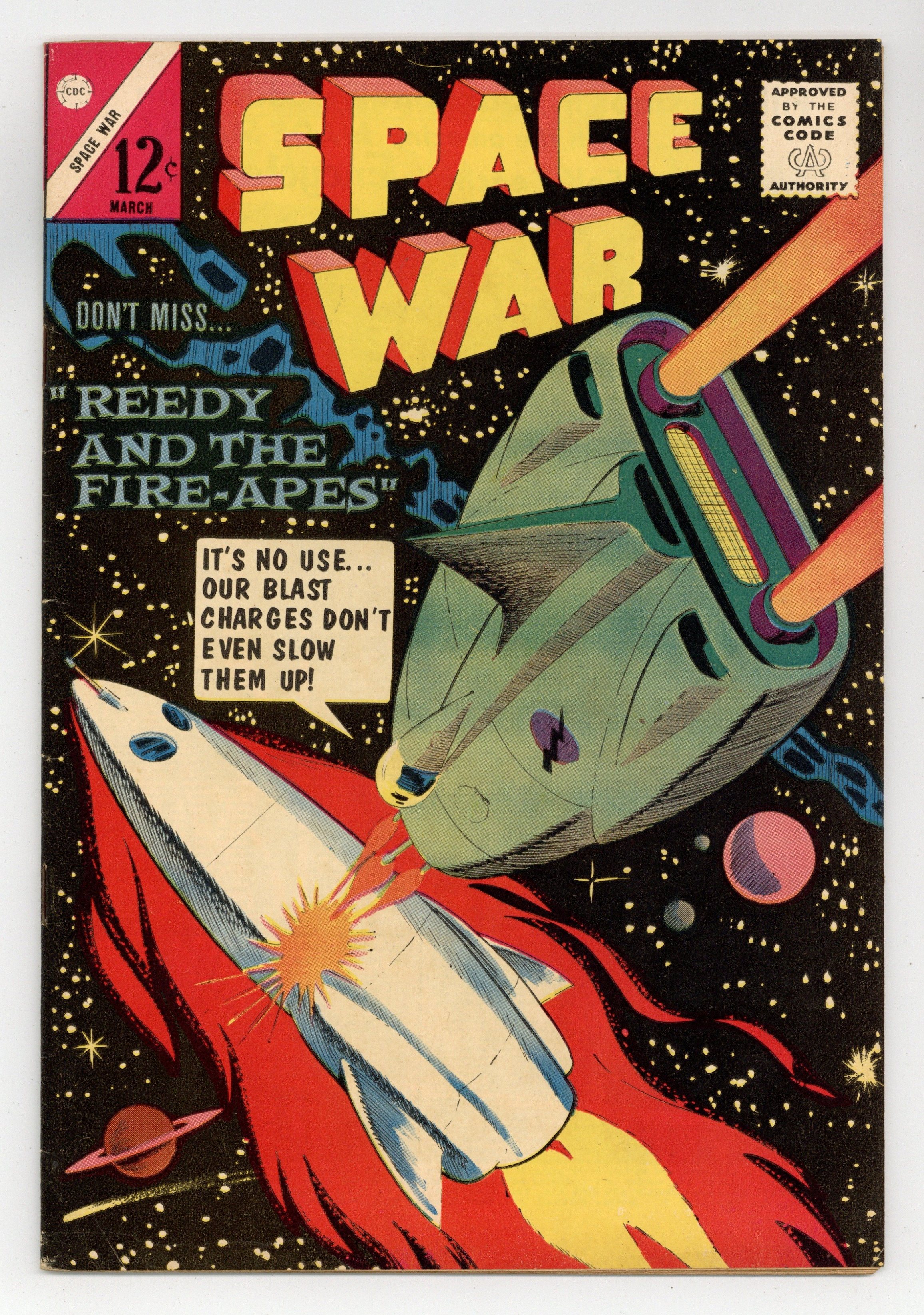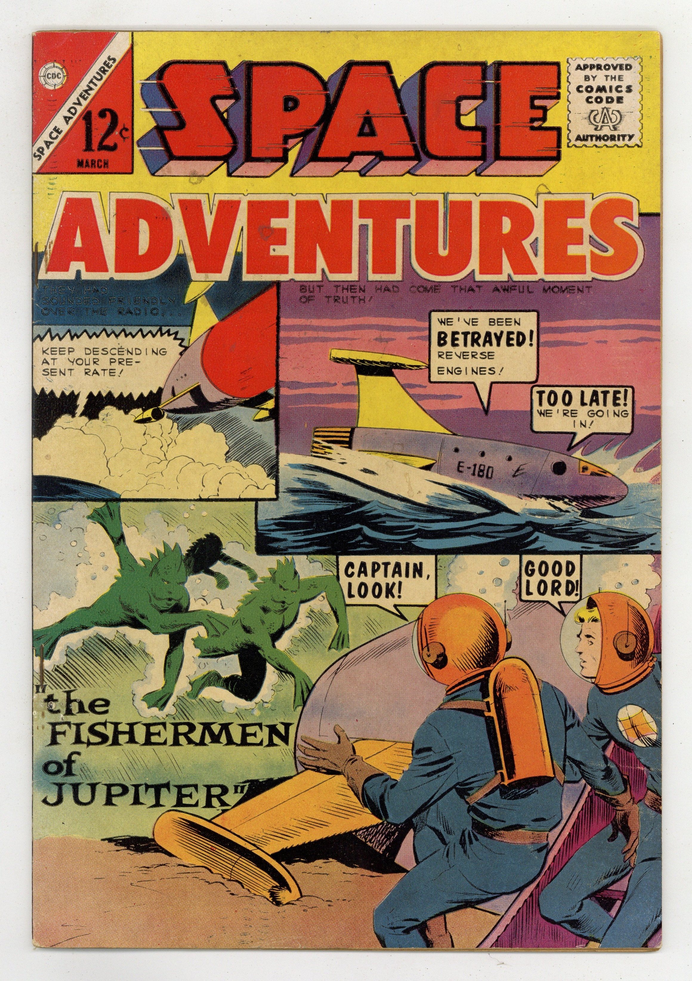 Cover by Dick Giordano. Stories and art by Bill Molno and others. Sci-fi and super-heroics from Charlton Comics. Astronauts exploring beneath the "seas" of Jupiter are attacked by gray Gill-Man-like creatures. Eartrhmen feel they're braving the dangers of the universe to explore new worlds - but the women of the planet Lugo don't quite see it that way. One lone human is all that stands between Earth and an alien invasion. The Fishermen of Jupiter; The Captive; When the Air Froze; The Birthday Present; All Alone; Space Narcosis. 32 pages, Full Color. Cover price $0.12.