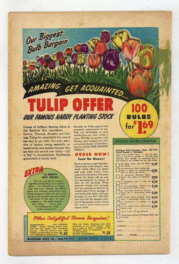 Cover art by Wayne Boring and Stan Kaye. 50 Ways to Kill Superman, art by Al Plastino. Volcano Vandals starring Congo Bill, art by Ed Smalle. World of Wishes starring Zatara, art by W. F. White. The Stolen Beaver starring Hayfoot Henry, script by Alvin Schwartz, art by Stan Kaye. The Color Wheel of Crime starring Vigilante. 52 Pages, Full Color. $.10 1st time Superman flies rather than leaps. Full-page ad for Dale Evans Comics #1. Cover price $0.10.