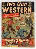 Cover pencils by Jack Kirby, inks by Dick Ayers. "The Beginning of the Two-Gun Kid," script by Stan Lee, pencils by Jack Kirby, inks by Dick Ayers; Matt Hawk arrives from the East; After helping Ben Dancer with two crooks, Ben teaches him all he knows and Matt becomes the Two-Gun Kid. "No Guns in Town" text story, art by Joe Maneely. "The Outcast," script by Stan Lee, art by Don Heck; Takawana schemes to remove Growling Bear and his son from power to become a Navaho Chief. "I Hate the Two-Gun Kid," script by Stan Lee, pencils by Jack Kirby, inks by Dick Ayers; Clem Carter and his gang rob Matt Hawk, taking money Nancy Carter had left with Matt. 36 pgs., full color. $0.10. Cover price $0.12.