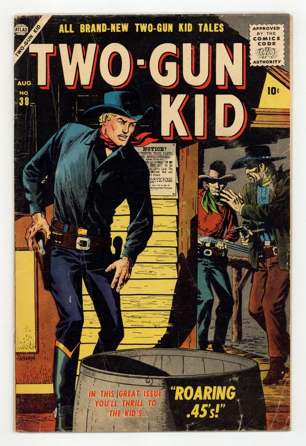 Cover by John Severin. "Roaring Forty-Fives!", art by Chuck Miller; The Two-Gun Kid rides into Gulchtown just in time to witness a lynch mob trying to take away Ben Frost who has pleaded guilty for the murder of Jess King, a well-liked rancher in the region. "The Riddle" text story, art by Chuck Miller. "Gunpowder Range!", art by Chuck Miller; The Two-Gun Kid is riding on the range when he is suddenly shot at by Corby, a sheep herder who is in a range war with Donlan, a rancher who has mistaken the Two-Gun Kid as one of Donlan's men. "Hot Lead!", art by Chuck Miller; With a powerful drought hitting the land, the Two-Gun Kid rides into town and stops for a drink of water when the dipper he uses from the communal well is shot out of his hand by Bart Maddox, who tells him that the local water is not for strangers. "One More Notch!", art by Bob Powell. "Killer's Ranch!", art by Chuck Miller; Answering a letter regarding his friend Seth Maple, the Two-Gun Kid rides into town to meet with his lawyer and saves an elderly man named Pop Heart from a gunslinger who tells Hart to get off some land. 36 pgs., full color. $0.10. Cover price $0.10.