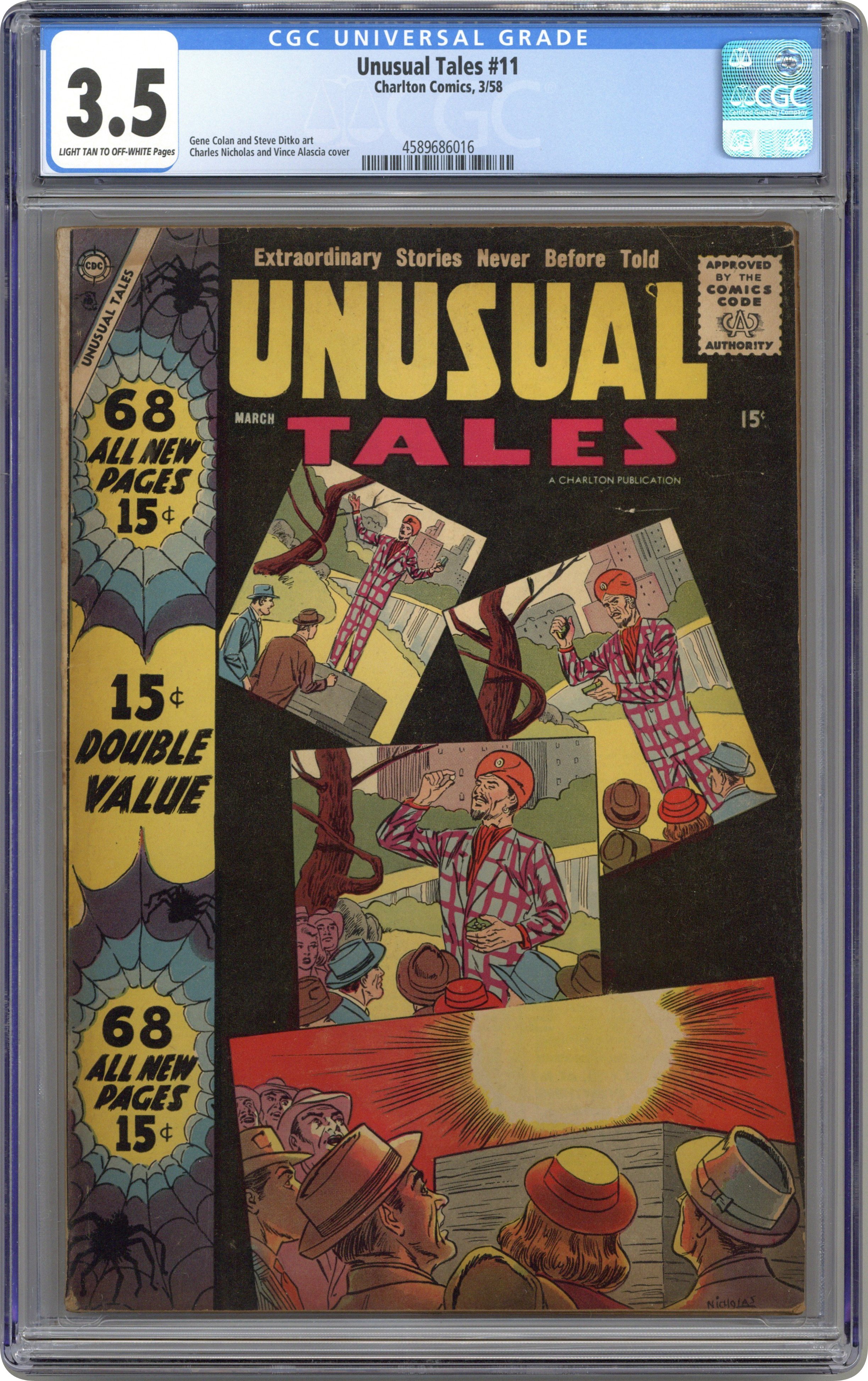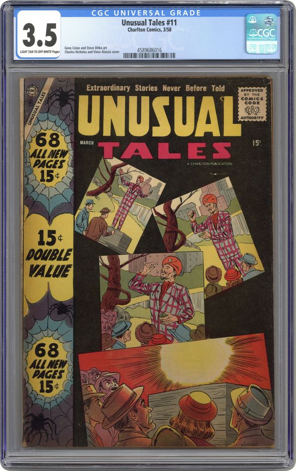 Cover by Charles Nicholas and Vince Alascia. Stories and art by Steve Ditko, Gene Colan, Charles Nicholas, Joe Gill, Maxwell Elkan, Sal Trapani, Rocco "Rocke" Mastroserio and Bill Molno. Strange stories of science fiction, fantasy and horror that fit within the guidelines of the new Comics Code. In one of four (!) stories this issue with art by Spider-Man co-creator Steve Ditko, a scientist's super-microscope reveals secrets humankind was not meant to know. In another Ditko story, a WWII military commander killed in battle returns to save his men. An eye transplant allows a blind man to see, but then he learns the donor was a psychotic killer, in a story featuring art by future Marvel legend Gene Colan. Dreamer; Second Chance; The Beast Legend; Charmed, Im Sure; The Right Spot; Deep in the Mountains; Unwelcome Caller; The Bad Eye; The Living Fog; Noise in the Cellar; The Ghost Gabs; The Man Who Couldnt Die; Dream On...! 64 pages, Full Color. Cover price $0.10.