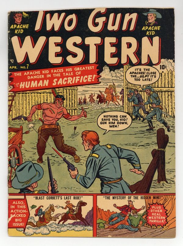 The Apache Kid stars in "The Human Sacrifice" (art by Joe Maneely), "Blast Corbett, Outlaw"; "Wanted"; and "The Secret Mine" (art by Mike Esposito). Cover price $0.10.