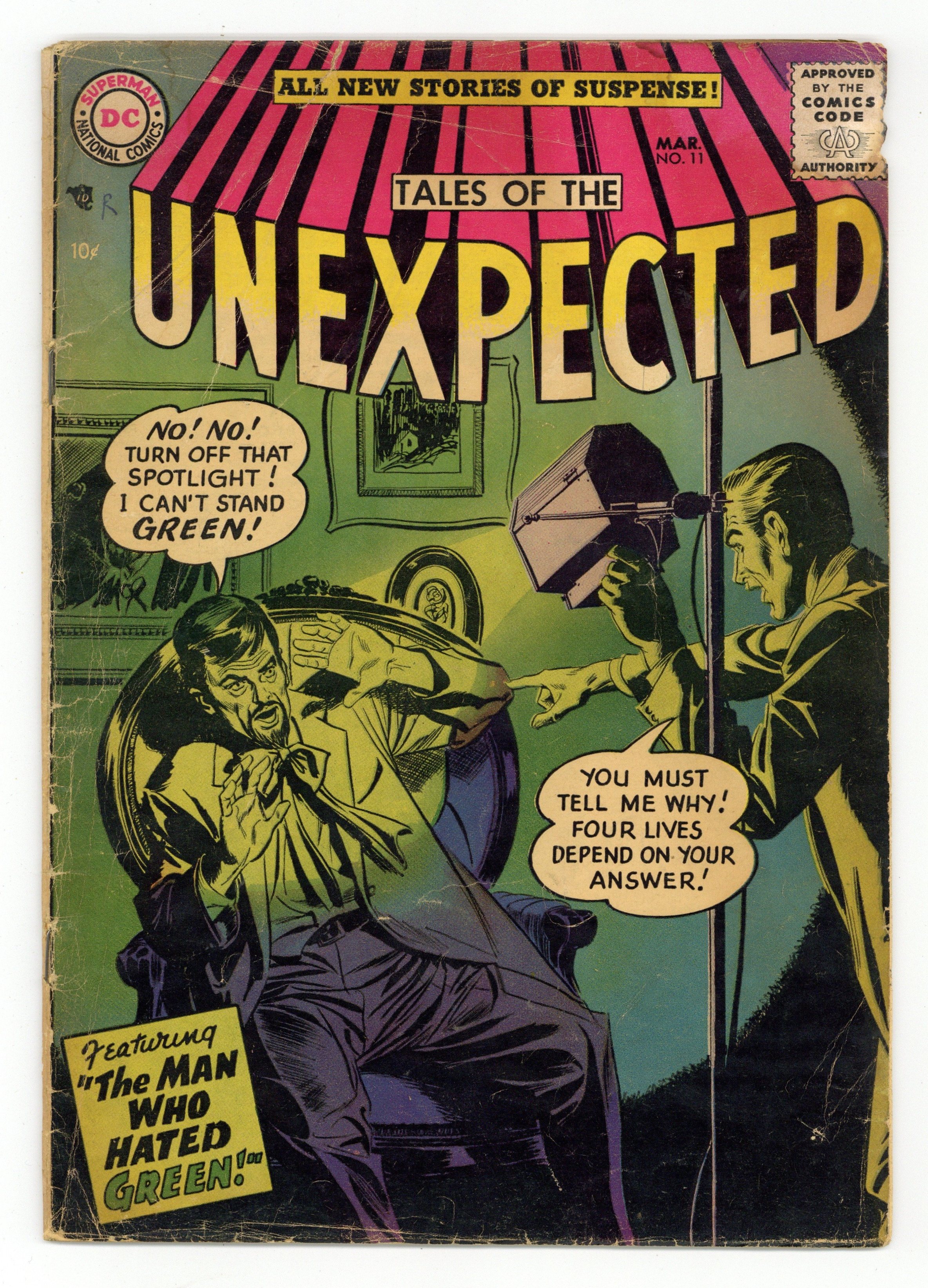 Cover art by Leonard Starr. "Who Am I?, art by Bernard Baily; A man with amnesia is forced to steal against his will by a disembodied head; He is a robot, and the head belongs to his creator; When the police trail the robot home, the scientist tries to escape, but he and the robot end up falling to their deaths. Buzzy's Special Brotherhood Week Quiz (Feb. 17-24) Do You Know the People of Your Country? public service announcement, script by Jack Schiff, art by Ruben Moreira. "I Was a Man from the Future, art by Nick Cardy; Blake travels back in time through a crevice in a mountain side where he frees a good man and falls in love with a beautiful girl; To protect his new friends he returns to the present for a weapon, but when he tries to rejoin them the crevice is gone and he is stuck in the present. Moolah the Mystic humor page by Henry Boltinoff. "The Ghost of Hollywood, art by Bill Ely; Miles Turner makes a deal with a ghost to help him create realistic special effects for a film; But when he is forced to break the deal, through no fault of his own, the ghost ruins the film. "The Bewitched Vehicle text story. "The Man Who Hated Green, art by Leonard Starr; The paintings of Jean Malreaux put their owners into comas; Hector Abbott notices the paintings lack the color green and deduces that the painter is an impostor with an aversion to the color green, striking out at people associated with that color. 36 Pages, Full Color. Cover price $0.10.