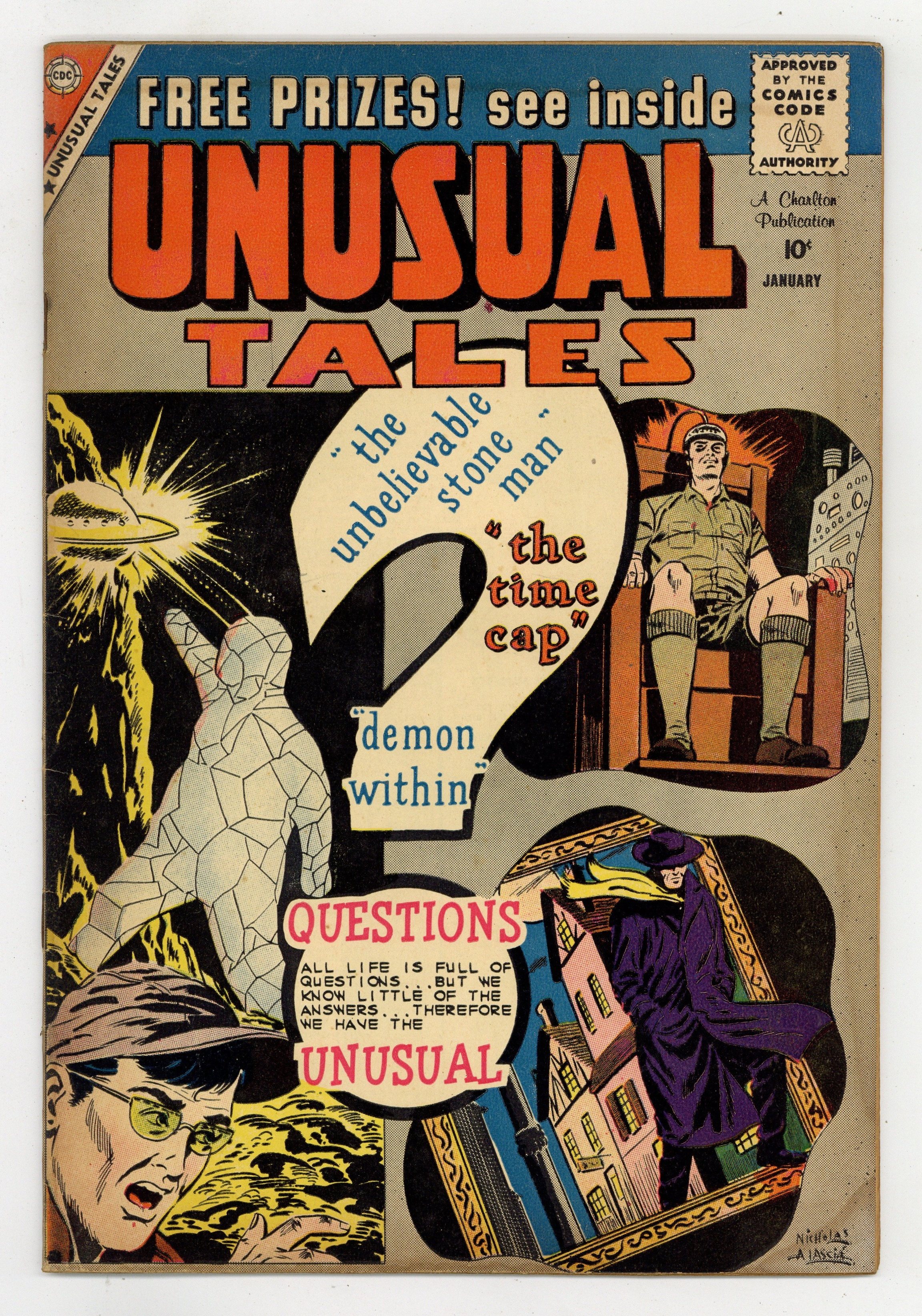 Cover pencils by Charles Nicholas, inks by Vince Alascia. "The Unbelievable Stone Man"; When an alien rock creature literally crashes on Earth, John Travers, fishing nearby, unwittingly reassembles him; Revealing his race's ominous plan to plunder the Earth, he begins transforming a giant rock into a spaceship to report back to his world; Travers saves the day by blowing up Norkan and his ship. "The Time Cap," pencils by Bill Molno, inks by Rocco "Rocke" Mastroserio; When part time explorer Phil Winship finds an ancient helmet in an an Iranian cave in the desert, he puts it on and is instantly transported 20,000 years into the past; Invisible to anyone in the past, Phil observes a scientist, Adab and his beautiful daughter Accara, and falls in love. "Bubbling Magic" text story. "The Demon Within," pencils by Charles Nicholas, inks by Rocco "Rocke" Mastroserio; A painter struggles with his own work. "The Incredible Advice," pencils by Matt Baker, inks by Vince Colletta. 36 pgs., full color. Cover price $0.10.
