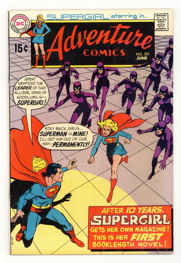 1st full length Supergirl story and her 1st solo book. First 15-cent cover price issue. Cover pencils by Curt Swan, inks by Neal Adams. The Supergirl Gang starring Supergirl, Superman, Batgirl, Judy Belson, Jonathan Maxom, and Albert Maxom, script by Cary Bates, pencils by Win Mortimer, inks by Jack Abel; Supergirl becomes the lead character in the series; here she leads an all-girl gang of hoodlums. Series continues from Action #375. 36 Pages, Full Color. Cover price $0.15.