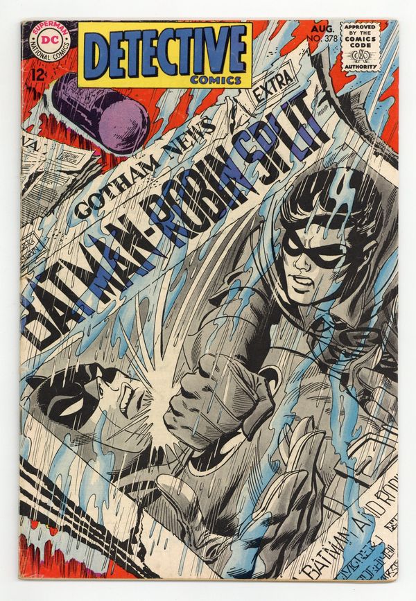 Cover by Neal Adams. "Man or Bat?," script by Frank Robbins, pencils by Neal Adams, inks by Dick Giordano; Kirk Langstrom appears again as the Man-Bat, this time he is forced to become the Batman's enemy; After stealing a vial from a chemical company's safe, much to Batman's chagrin, Kirk returns to his lab above the Gotham Museum of Natural History; He believes he has finally found a mixture that can cure his transformation, until Batman bursts through the door in pursuit, causing him enough surprise to drop the compound onto the floor; With a screech of rage, Kirk fights off the Batman and leaps out the window; During his escape, he starts to evolve a leathery pair of wings that allow him to fly. "My Place In The Sun!," script by Mike Friedrich, pencils by Gil Kane, inks by Vince Colletta; Speedy visits Robin at Hudson University; Robin begins to question if he should continue to be Robin. Letter from comics writer Martin Pasko. 36 pgs., full color. $0.15. Cover price $0.15.