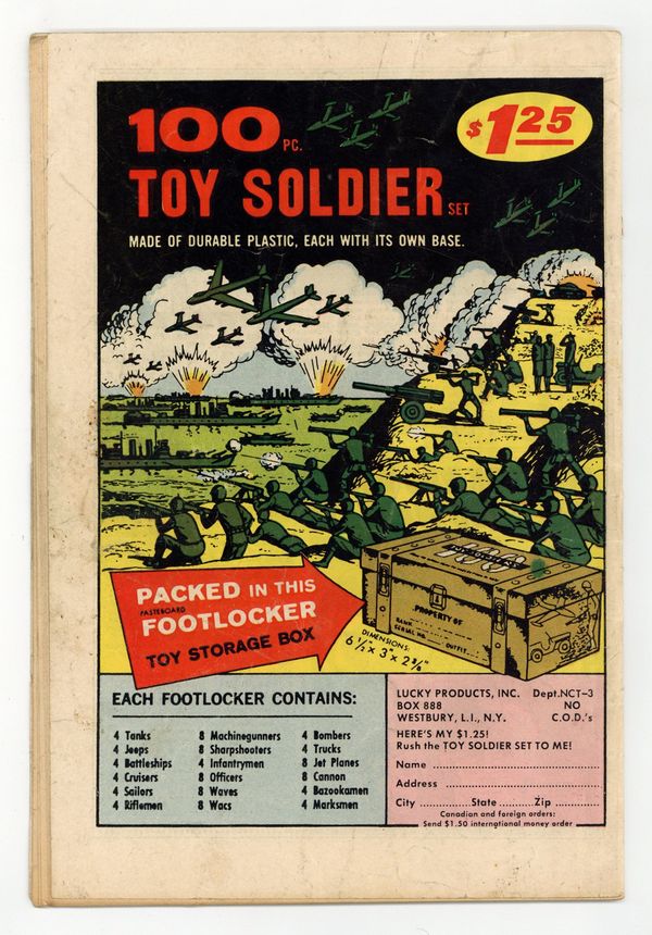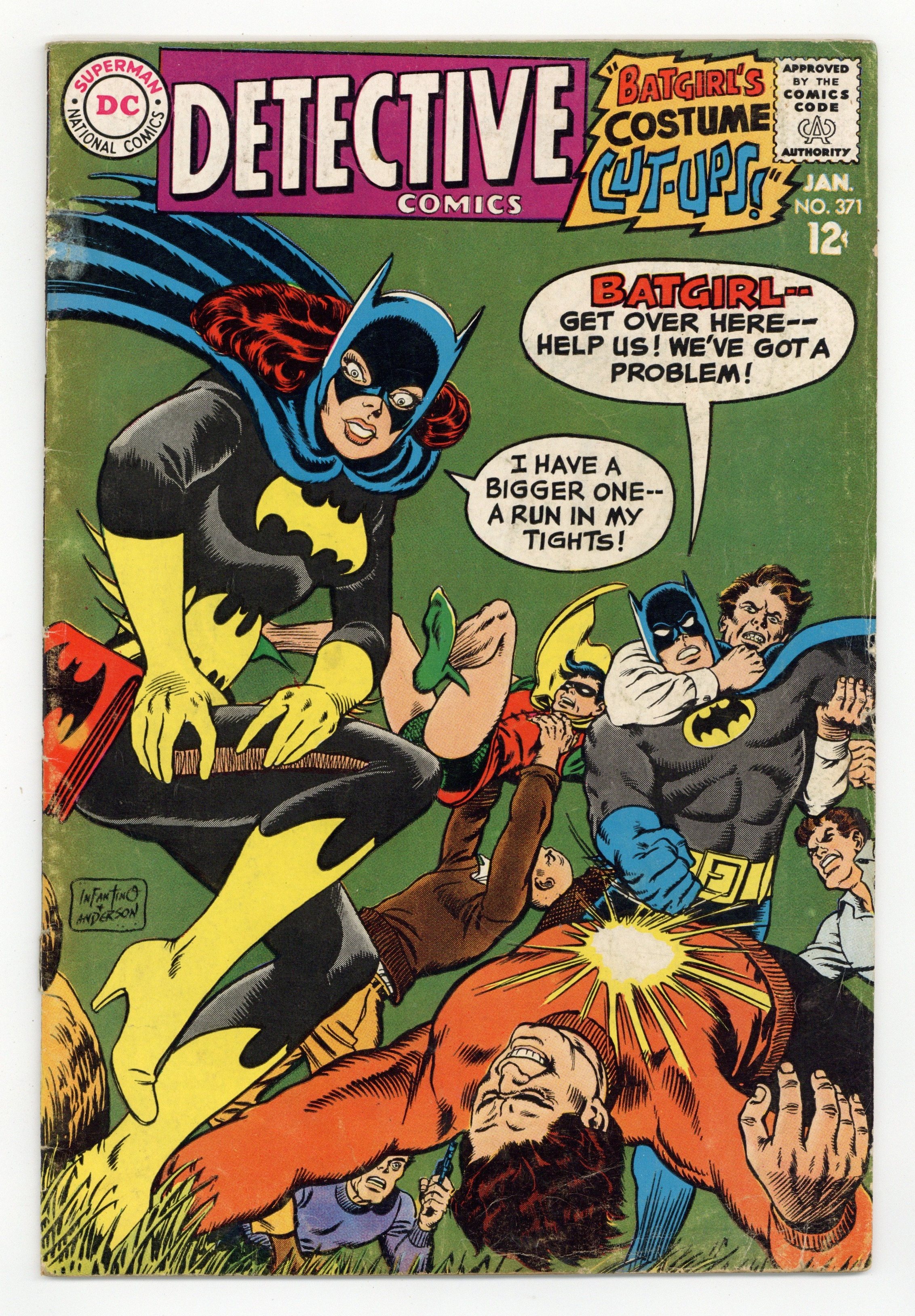 Written by Gardner Fox. Art by Carmine Infantino and Sid Greene. Cover by Carmine Infantino and Murphy Anderson. 1st appearance of the new Batgirl (Barbara Gordon) in The Million Dollar Debut of Batgirl!; Batgirl goes to a costume party dressed as Batgirl; she sees Killer Moth attack Bruce Wayne. Written by Gardner Fox. Art by Murphy Anderson. Riddle of the Sleepytime Taxi!; Ralph Elongated Man Dibny and Sue fall asleep in the back seat of a taxi while going to a costume party; Ralph discovers that crooks criminals are putting passengers to sleep to copy secret documents. Cap's Hobby Hints activity page by Henry Boltinoff. Letter to the editor from comics writer Mark Evanier. 36 pages, full color. $0.12. Cover price $0.12.