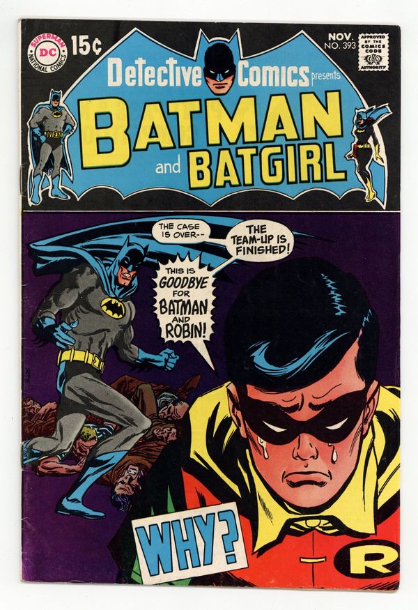 Cover by Neal Adams. "You Die By Mourning!," script by Frank Robbins, pencils by Bob Brown, Carmine Infantino (splash page only), inks by Frank Giacoia; Bruce Waynes V.I.P. office is visited by a mysterious woman who claims before running out that her husband will be murdered by morning, and Batman investigates. "Break-Out!," script by Mike Friedrich, pencils by Gil Kane, inks by Vince Colletta; Robin helps the police track down the escaped juvenile delinquents. Letter from comics writer Mike Barr. 36 pgs., full color. $0.15. Cover price $0.15.