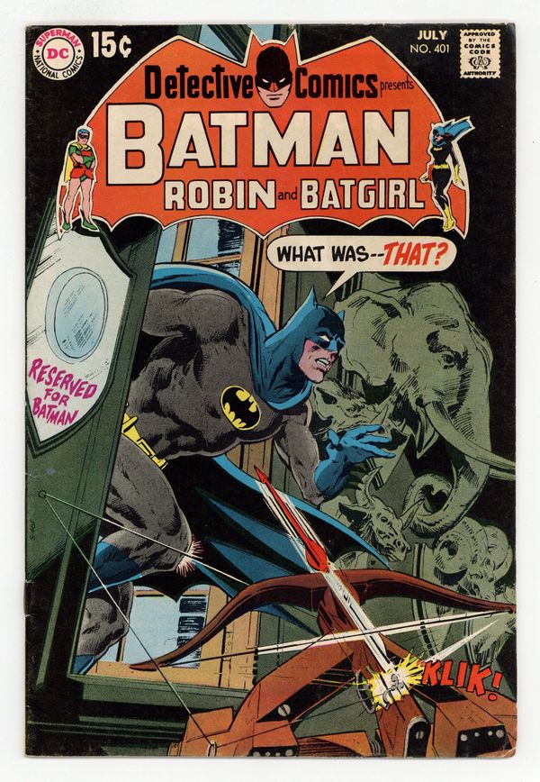 Cover by Neal Adams. "The House That Haunted Batman!," script by Len Wein and Marv Wolfman, pencils by Neal Adams, inks by Dick Giordano; Robin goes missing and Batman finds a house that wasn't there yesterday; Strange things happen around Batman until he meets the owner of the house; Cameos by Superman, Flash, Green Lantern, Green Arrow, and Hawkman. "Batgirl vs. the Phantom Bullfighter!," script by Frank Robbins, pencils by Don Heck, inks by Dick Giordano; In order to aquire the manuscript "Of Fighting Bulls and Men" for the Gotham Library, Barbara Gordon must travel to Madrid, Spain. There she is the guest of Don Alvarado, owner of the manuscript, who takes her to see its subject: a bull fighter named El Grandos. Science in Crime Detection article. 1971 Batman calendar (also works for the years 2010, 2021, 2027, 2038, 2049, and others). Letter to the editor from comics writer Martin Pasko. 36 pgs., full color. $0.15. Cover price $0.15.