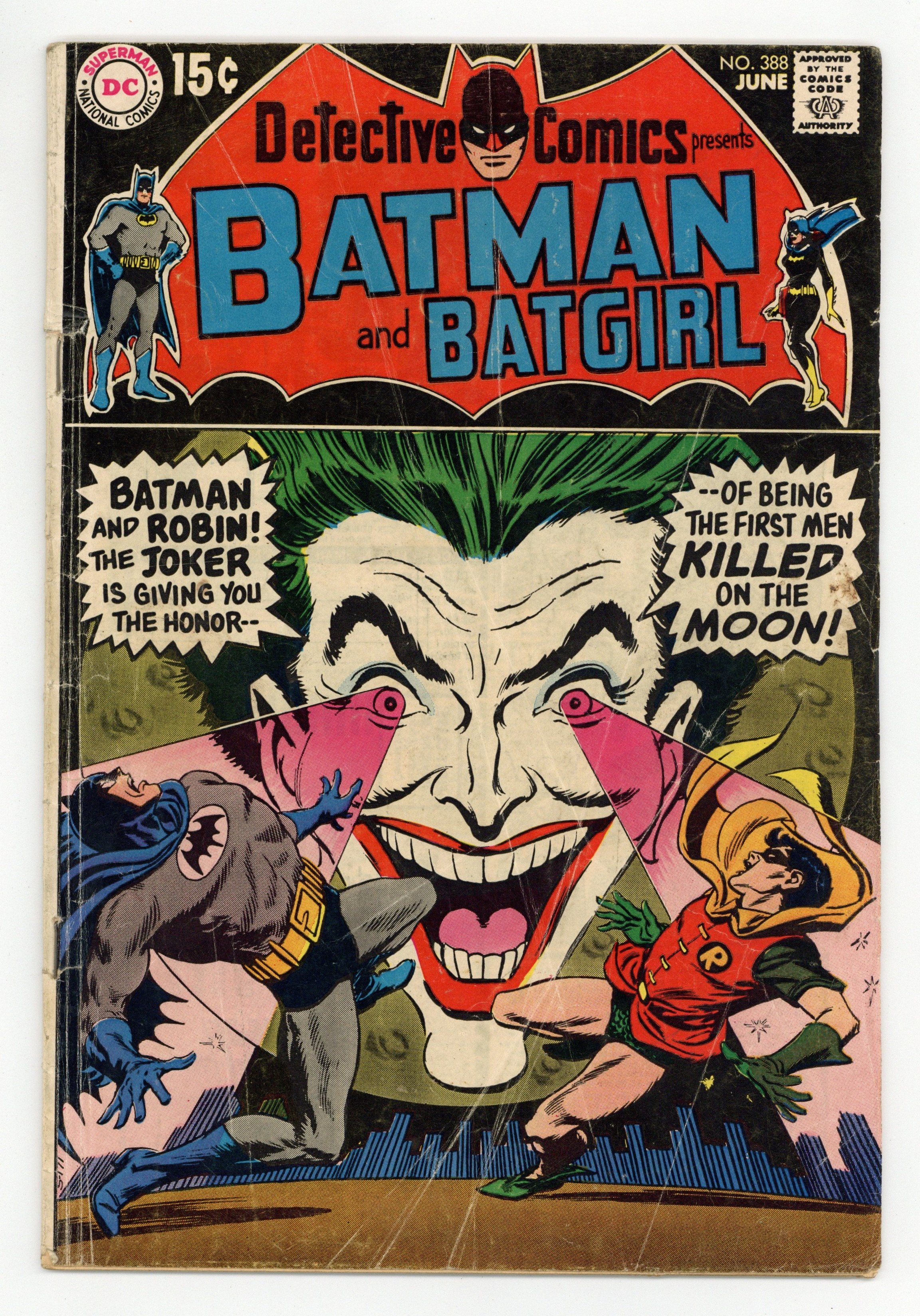 Cover by Neal Adams. Milestone issue featuring 1st appearance of Man-Bat in "Challenge of the Man-Bat!", script by Frank Robbins, pencils by Neal Adams, inks by Dick Giordano; Zoologist Kirk Langstrom is working late at the Gotham Natural History Museum putting together a bat habitat; he aims to perfect a serum that can endow people with enhanced auditory abilities via a specialized bat gland extract; Elsewhere in the city, a group of thieves known as the Blackout Gang break into a vault; Back at the museum, Kirk Langstrom is pleased with his progress and decides to test his new formula upon himself; he mutates into Man-Bat. "A Burial for Batgirl!," script by Denny O'Neil, pencils by Gil Kane, inks by Vince Colletta; Barbara Gordon has come to Hudson University to help with a Edgar Allen Poe festival; She discovers a murder and captures Hank Osher, who appears to be the murderer; Batgirl begins to believe that Hank has been framed and investigates further, which leads to her being captured and bricked into a wall. Letter to the editor from writer Alan Brennert. 36 pgs., full color. $0.15. Cover price $0.15.