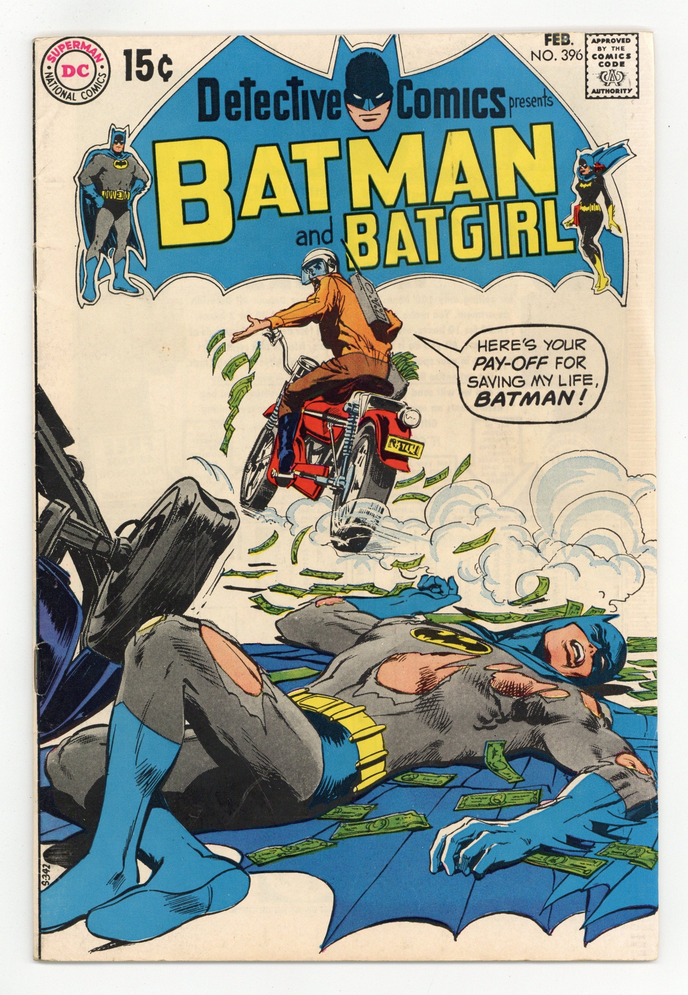 Cover pencils by Neal Adams, inks by Dick Giordano. "Man in the Eternal Mask!," script by Frank Robbins, pencils by Bob Brown, inks by Frank Giacoia; Batman and an artist must discover the identity of a mysterious mutilator of the artists portraits. "Night of the Sharp Horns!," script by Frank Robbins, pencils by Don Heck, inks by Dick Giordano; Continuing from last issue... Barbara Gordon was in Madrid, Spain, to collect a rare manuscript for Gotham Library when she suddenly found herself caught up in a murder mystery involving an aging bull fighters lost bull; Suspecting bull fighter El Grandos, a young bullfighter named Paco, or the grounds keeper Manolo as potential suspected, Batgirl sets out to search for clue and stop the "Phantom Bullfighter" from striking again the next night. Letter to the editor from cartoonist Michael Cherkas. Statement of ownership - average print run 406,782; average paid circulation 209,630. 36 pgs., full color. $0.15. Cover price $0.15.