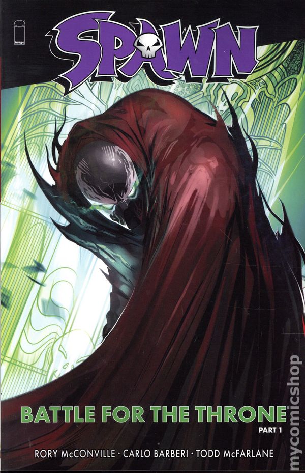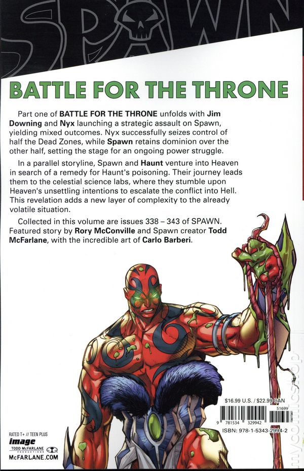 Volume 1 - 1st printing. Collects Spawn (1992) #338-343. Written by Rory McConville and Todd McFarlane. Art by Carlo Barberi. Cover by Kibar. Back Cover by Carlo Barberi. Part one of BATTLE FOR THE THRONE! Jim Downing and Nyx's attack on Spawn had mixed results, with Nyx controlling half the Dead Zones while Spawn holds the other half. Meanwhile, Spawn and Haunt infiltrate Heaven to find a cure for Haunt's poison, leading them to Heaven's science labs, only to discover Heavens dubious plans to take the war to Hell. Softcover, 168 pages, full color. Teen+ Cover price $16.99.