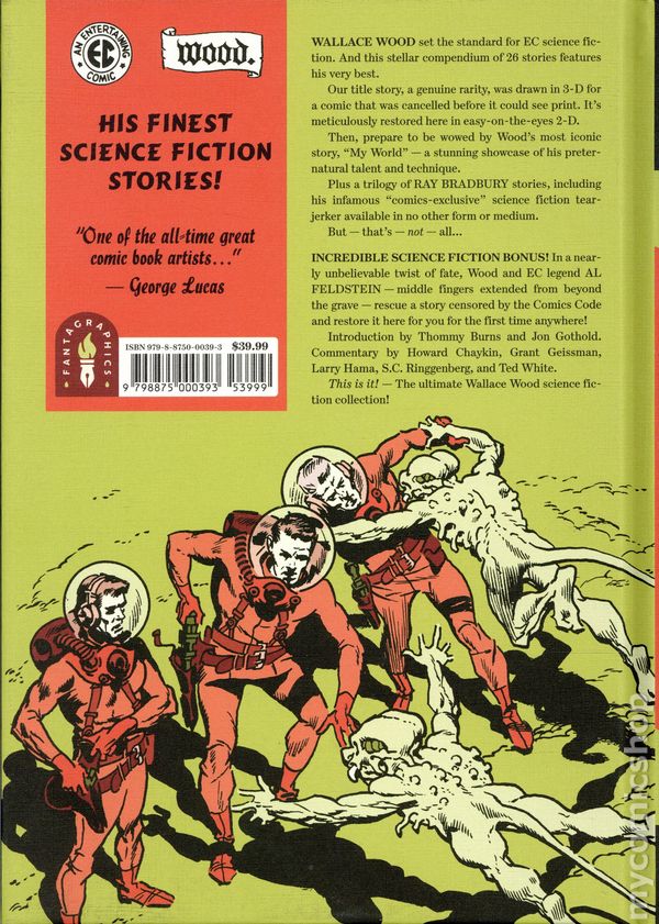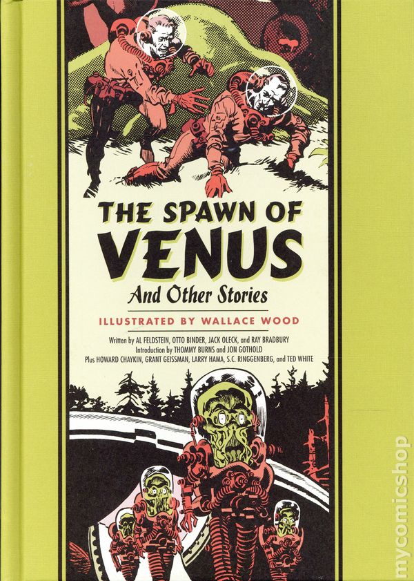 1st printing. Written by Al Feldstein, Otto Binder, Jack Oleck, and Ray Bradbury. Art and cover by Wallace Wood. Introduction by Thommy Burns and Jon Gothold. Chapter Introductions by Howard Chaykin, Grant Geissman, Larry Hama, S.C. Ringgenberg, and Ted White. This mouth-watering collection features the finest (and rarest!) science fiction stories Wallace Wood ever drew — more than two dozen! Woods meticulously detailed, genre-defining brushwork introduces you to breathtaking planetary vistas, terrifying aliens, and sleek rocket ships surging with the power to conquer the stars.Our title story is a rarity that never appeared in any EC comic. Written and drawn for a 3-D comic that was canceled before it could be printed, we present it here in easy-on-the-eyes 2-D. Then, Woods most iconic story, My World is a stunning showcase of the preternatural talent and technique he brought to all his stories. Also included are his trilogy of Ray Bradbury adaptations — Home to Stay, There Will Come Soft Rains… and Mars Is Heaven! — plus He Walked Among Us, a what if…? variation on Bradburys The Man from The Illustrated Man.But thats not all! An incredible science fiction bonus: Al Feldstein wrote many stories of people reaching from the beyond to right a wrong, but with this volume, in a twist worthy of the best of EC, he does the same himself! In 1955, the Comics Code rejected the second page of You, Rocket and forced EC to completely rewrite and redraw it. When the original art for that rejected page was rediscovered, one panel was missing. But Feldstein, in a middle-finger gesture to the Code and its heavy-handed censorship, wrote a new panel, restoring You, Rocket to what it was always meant to be. Sadly, he passed away before his final EC writing assignment was published. But here it is now, for the first time anywhere. Justice from beyond the grave.26 stories in all, most scripted by EC legend Al Feldstein, plus in-depth commentary by EC experts Thommy Burns, Grant Geissman, and Jon Gothold. The Spawn Of Venus And Other Stories is the ultimate EC Wallace Wood science fiction collection. Hardcover, 232 pages, B&W. Mature Readers Cover price $39.99.