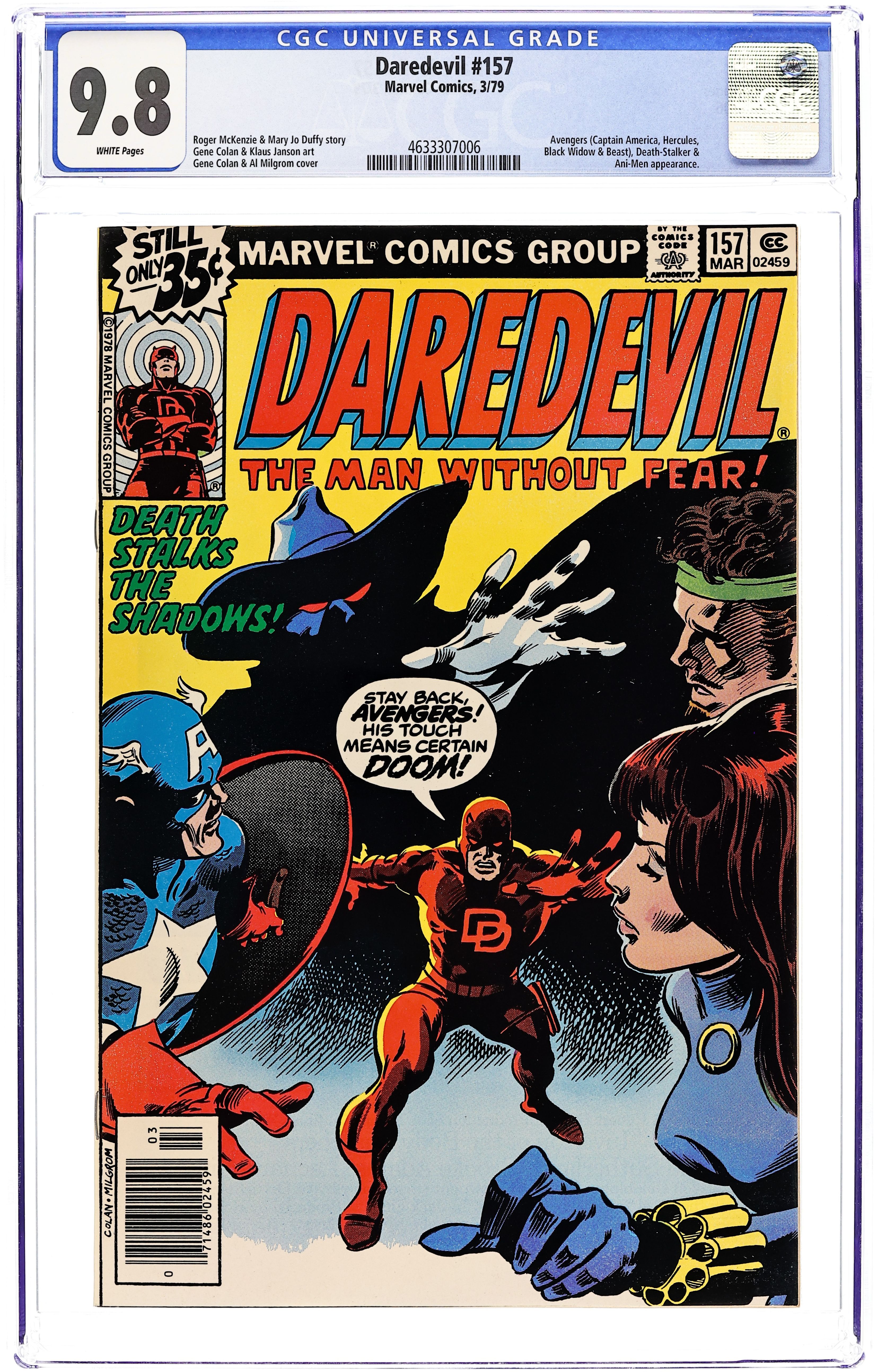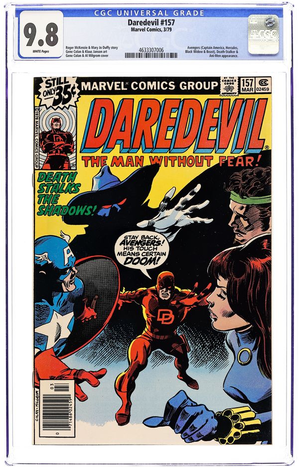 Last 35-cent cover price. Cover pencils by Gene Colan, inks by Al Milgrom. The Avengers (Captain America, the Black Widow, the Beast) and Hercules guest star in The Ungrateful Dead, script by Roger McKenzie (plot) and Mary Jo Duffy (script), pencils by Gene Colan (breakdowns) and Klaus Janson (finished art), inks by Klaus Janson; DD and the Avengers ward off Death-Stalker; The Ani-Men wreak havoc in the storefront law office trying to capture Matt; appearances the new Unholy Three (the second Ape Man, the third Bird Man, the third Cat Man). 36 pgs. Cover price $0.35. Cover price $0.35.