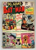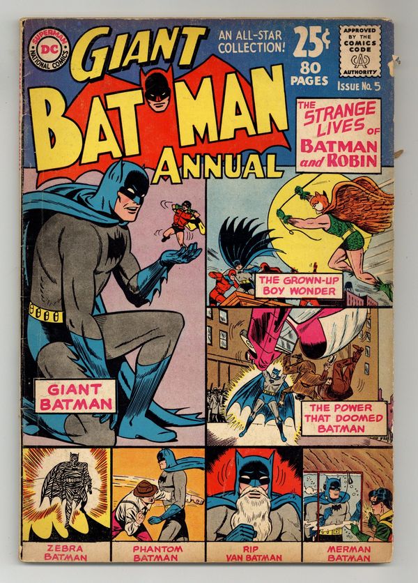 Summer 1963. All reprints. Cover pencils by Sheldon Moldoff and Dick Sprang, inks by Charles Paris and Stan Kaye. "The Power that Doomed Batman," script by Bill Finger, pencils by Sheldon Moldoff (ghost for Bob Kane), inks by Charles Paris; Batman takes up a plane on an experimental flight, and, after crossing through the tail of a comet, finds himself glowing strangely and endowed with super powers. "The Merman Batman," script by Bill Finger, pencils by Sheldon Moldoff (ghost for Bob Kane), inks by Charles Paris; While chasing down a wanted criminal, Batman is struck by lightning and falls into the harbor. "Rip Van Batman," script by Bill Finger, pencils by Sheldon Moldoff (ghost for Bob Kane), inks by Charles Paris; Looking for criminal Al Hackett, Batman enters a greenhouse; After succumbing to the strange floral vapors, he passes out; On awakening, he finds himself in the future. "The Zebra Batman," script by Bill Finger, pencils by Sheldon Moldoff (ghost for Bob Kane), inks by Charles Paris; An insideous criminal discovers a way to charge his body like a magnet to commit crimes, but Batman, in trying to stop him, accidently becomes charged as well. "The Grown-Up Boy Wonder," script by Bill Finger, pencils by Sheldon Moldoff (ghost for Bob Kane), inks by Stan Kaye; While examining a lead-lined box Superman had brought back from outer space, Dick accidently touches a release, emitting a gas that causes him to grow bodily into manhood, thus forcing him to give up his Robin persona and to adopt a different crime fighting ID--The Owlman. "The Bewitched Batman," script by Jerry Coleman, pencils by Curt Swan. "The Phantom Batman," script by Edmond Hamilton, pencils by Dick Sprang, inks by Charles Paris. "The Giant Batman," script by Edmond Hamilton, pencils by Dick Sprang, inks by Charles Paris. 84 pgs., full color. Cover price $0.25.