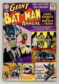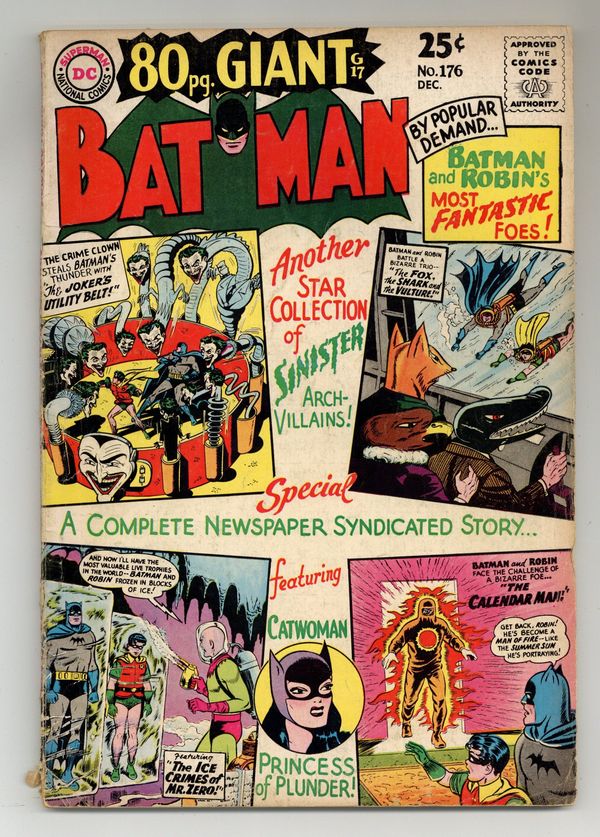 Reprints, 80-page giant. Cover pencils by Dick Sprang, Sheldon Moldoff, and Curt Swan, inks by Charles Paris and George Klein. "The Parasols of Plunder" (from Batman # 70) starring Batman and Penguin, script by Bill Woolfolk, pencils by Bob Kane and Lew Schwartz, inks by Charles Paris; The Penguin is released from prison on parole, providing he gives up anything having to do with birds; So he takes up an umbrella business. Builders of the Future! public service announcement about the importance of UNESCO funding in building schools in Africa, art by Sheldon Moldoff. "The Fox, The Shark, and the Vulture" (from Detective 253) starring Batman, script by Dave Wood, pencils by Sheldon Moldoff, inks by Charles Paris; A weird trio hijacks artifacts from a world tour of historical artifacts exhibit; A sharp witted Batman figures out the trio's lair and overcomes them . "The Ice Crimes of Mr. Zero" (from Batman 121) starring Batman and Mr. Zero (later Mr. Freeze), script by Dave Wood, pencils by Sheldon Moldoff, inks by Charles Paris; A scientist accidentally falls victim to the effects of an experiment, making him a virtual "human icicle," a foe who puts the chill on Batman and Robin. A complete Sunday newspaper syndicated story (8 pages) from April-June, 1946, Catwoman, Princess of Plunder!, script by Alvin Schwartz, pencils by Jack Burnley and Fred Ray, inks by Win Mortimer. Cap's Hobby Center activity page by Henry Boltinoff. "The Caveman at Large" (from Batman 102), script by Bill Finger, pencils by Sheldon Moldoff, inks by Charles Paris; A freak accident causes a great character actor to assume the character's persona he is dressed up to portray: a caveman! "The Challenge of the Calendar Man (from Detective 259), script by Bill Finger, pencils by Sheldon Moldoff, inks by Charles Paris; A new criminal, in trying to make a name for himself, challenges Batman to a duel of wits with all of his crimes being based on the "five" seasons. "The Joker's Utilty Belt" (from Batman 73), script by David Vern pencils by Dick Sprang, inks by Charles Paris; When the Joker's seemingly easy capture of the Caped Crusaders goes terribly wrong when Batman springs a surprise on him using his utility belt, the Crime Clown decides to outdo the Batman with his own utility belt! 84 Pages, Full Color. Cover price $0.25.