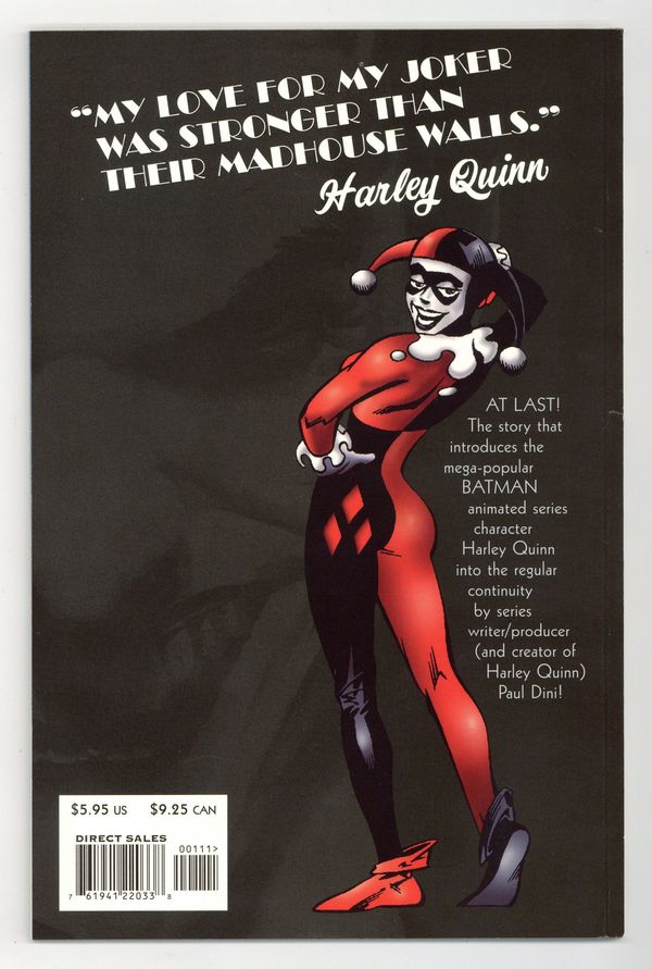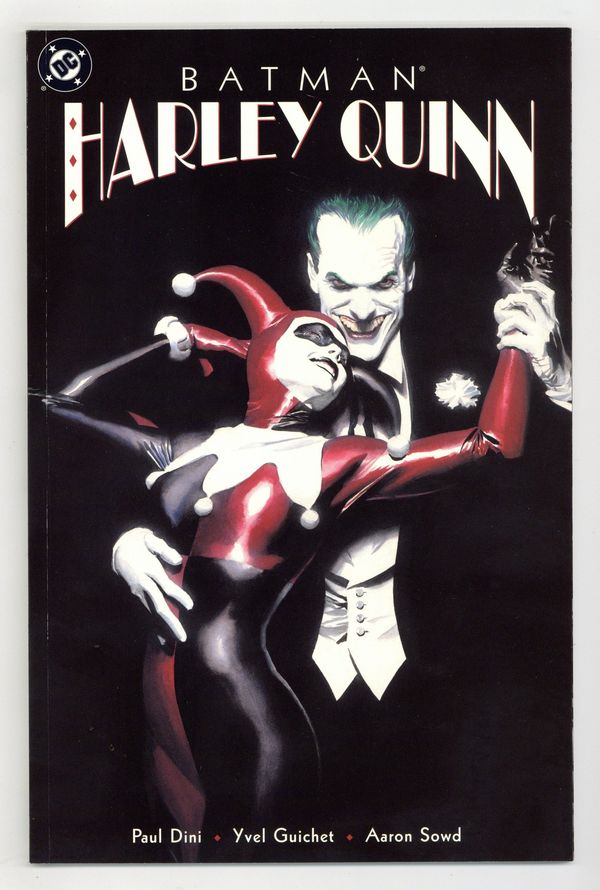 1st Printing (2nd and 3rd printings have 2nd and 3rd printing notices on inside front cover). Written by Paul Dini; art by Yvel Guichet and Aaron Sowd; painted cover by Alex Ross. The most popular character introduced in Batman's animated adventures enters the DC Universe and "No Man's Land" in a Prestige one-shot written by Harley's creator, Paul Dini (SUPERMAN: PEACE ON EARTH), with a painted cover by PEACE ON EARTH's Alex Ross and stunning interiors by Yvel Guichet and Aaron Sowd. Since Gotham's fall, the Joker has been relatively quiet...but that's about to change as former Arkham Asylum doctor Harleen Quinzel joins the Clown Prince of Crime to put him back on top. But when their unusual partnership leaves Harley a little worse for wear, she enlists Poison Ivy's help. Now the Joker and Batman are going to learn that this souped-up Harley's not going to be pushed around anymore. Prestige Format. FC, 52 pg.$5.95" Batman No Man's Land Cover price $5.95.