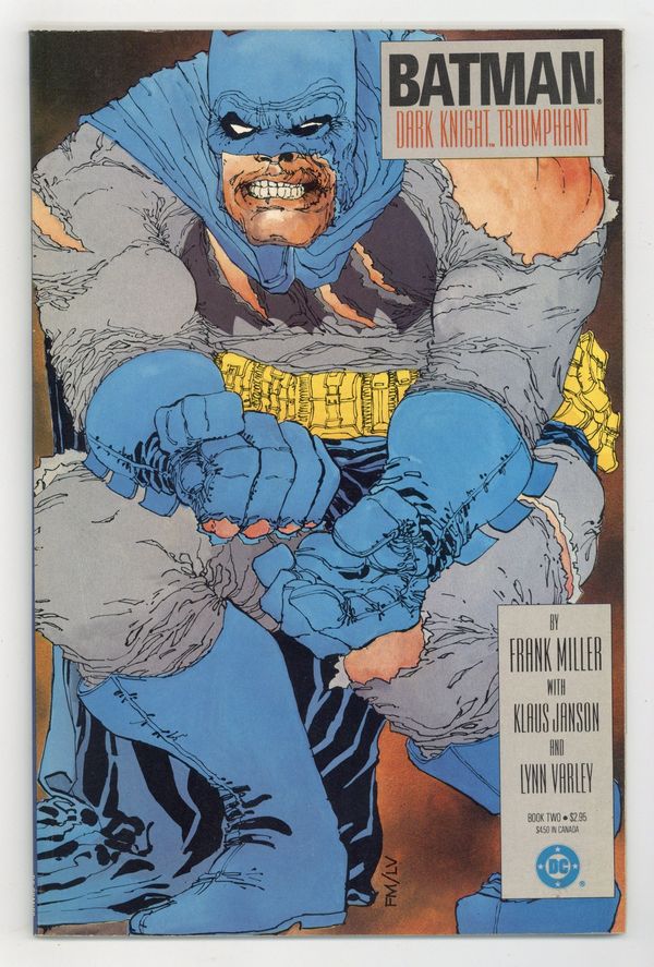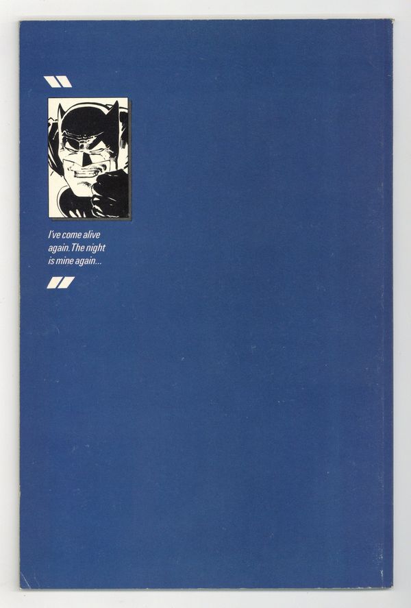 First printing. Direct Edition. NOTE: 1st printing has almost matching grey background on inside front cover and facing page. 2nd printing doesn't have matching gray background--grays are very different. 3rd printings are labeled as such. Cover by Frank Miller. "Dark Knight Triumphant," script by Frank Miller, pencils by Frank Miller, inks by Klaus Janson; an aging Batman battles the Mutant gang and their anonymous leader; While walking to work, considering retirement, Jim Gordon is almost killed by a 17-year old boy with an M60; Carrie Kelly, a young girl who owes her life to Batman, seeks out her hero and becomes Robin. 52 pgs., full color. Cover price $2.95.