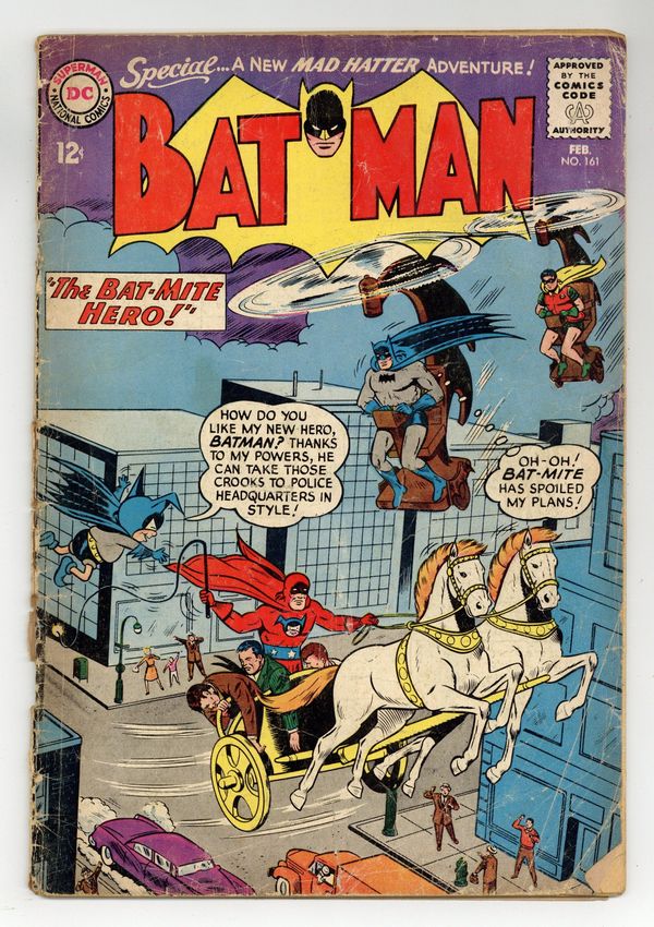 Cover art by Sheldon Moldoff. "The New Crimes of the Mad Hatter," script by Dave Wood, pencils by Sheldon Moldoff, inks by Charles Paris; The Mad Hatter pulls a string of robberies based on the professions of the jurors that sentenced him on his last arrest. Special Christmas Quiz -- "Christmas in Many Lands!" public service announcement, art by Ruben Moreira. "The Bat-Mite Hero," script by Dave Wood, pencils by Sheldon Moldoff, inks by Charles Paris; Batman corners a wanted felon in a baseball stadium, but Bat-Mite appears and messes things up with his magical nonsense. Batman tells him to find another hero to pester, so Bat-Mite creates a series of heroes (the third a crook), but they fail miserably. Half-page Casey the Cop story by Henry Boltinoff. 36 Pages, Full Color. Cover price $0.12.