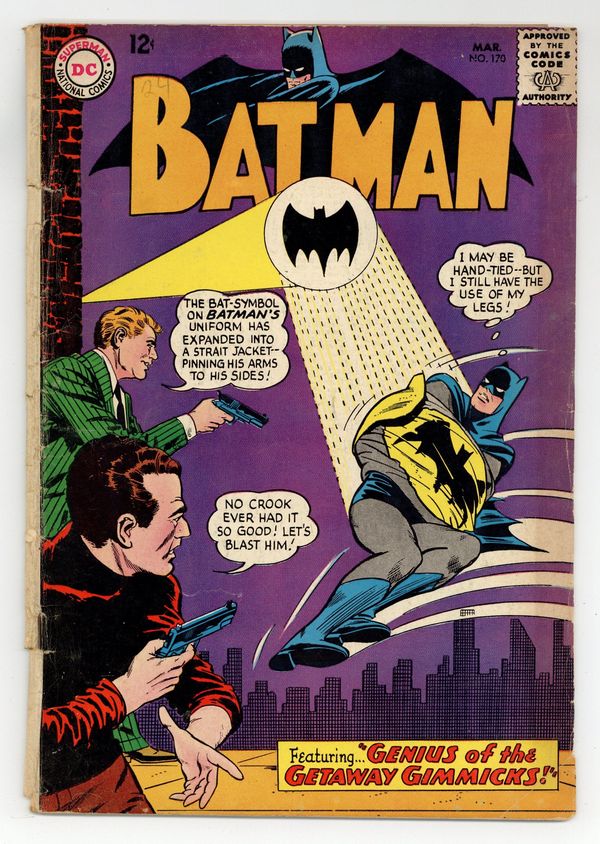 Cover pencils by Carmine Infantino, inks by Joe Giella. Friends Across the Seas public service announcement, art by Sheldon Moldoff. "Genius of the Getaway Gimmicks!", script by Gardner Fox, pencils by Sheldon Moldoff (as Bob Kane), inks by Sid Greene; Roy Reynolds, wanting to not make the same mistakes of other criminals, decides to uses a series of getaway gimmicks on the Caped Crusader to effect the escape of he and his men...and succeeds, until Batman baits a trap of his own. "The Puzzle of the Perilous Prizes!", script by Bill Finger, art by Joe Giella (as Bob Kane); When Batman and Robin investigate who entered a contest for an elderly lady, they end up capturing an entirely unrelated gang who think Batman and Robin are after them. Pore Identification non-fiction half-page, script by Julius Schwartz, pencils by Morris Waldinger, inks by Tom Nicolosi. Letter to the editor from comics writer Mike Friedrich. 36 Pages, Full Color. Cover price $0.12.