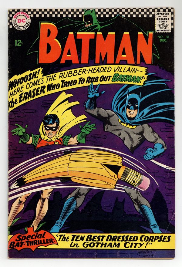 Cover pencils by Carmine Infantino, inks by Joe Giella. "The Eraser Who Tried to Rub Out Batman!", script by Robert Kanigher, pencils by Sheldon Moldoff (as Bob Kane), inks by Joe Giella; Commissioner Gordon gets Batman to investigate a series of crimes in which all of the clues have been erased, and the Caped Crusader goes undercover to do so. Cap's Hobby Hints activity half-page by Henry Boltinoff. "The Ten Best-Dressed Corpses in Gotham City!", script by John Broome, pencils by Sheldon Moldoff (as Bob Kane), inks by Sid Greene; A newspaper publisher calls in the Police and Batman, explaining to them that three of the men on his magazine's top-ten best dressed list have been murdered; Batman agrees to investigate and nearly dies himself as Bruce Wayne, who also was listed on the newspaper's listing. 36 Pages, Full Color. Cover price $0.12.