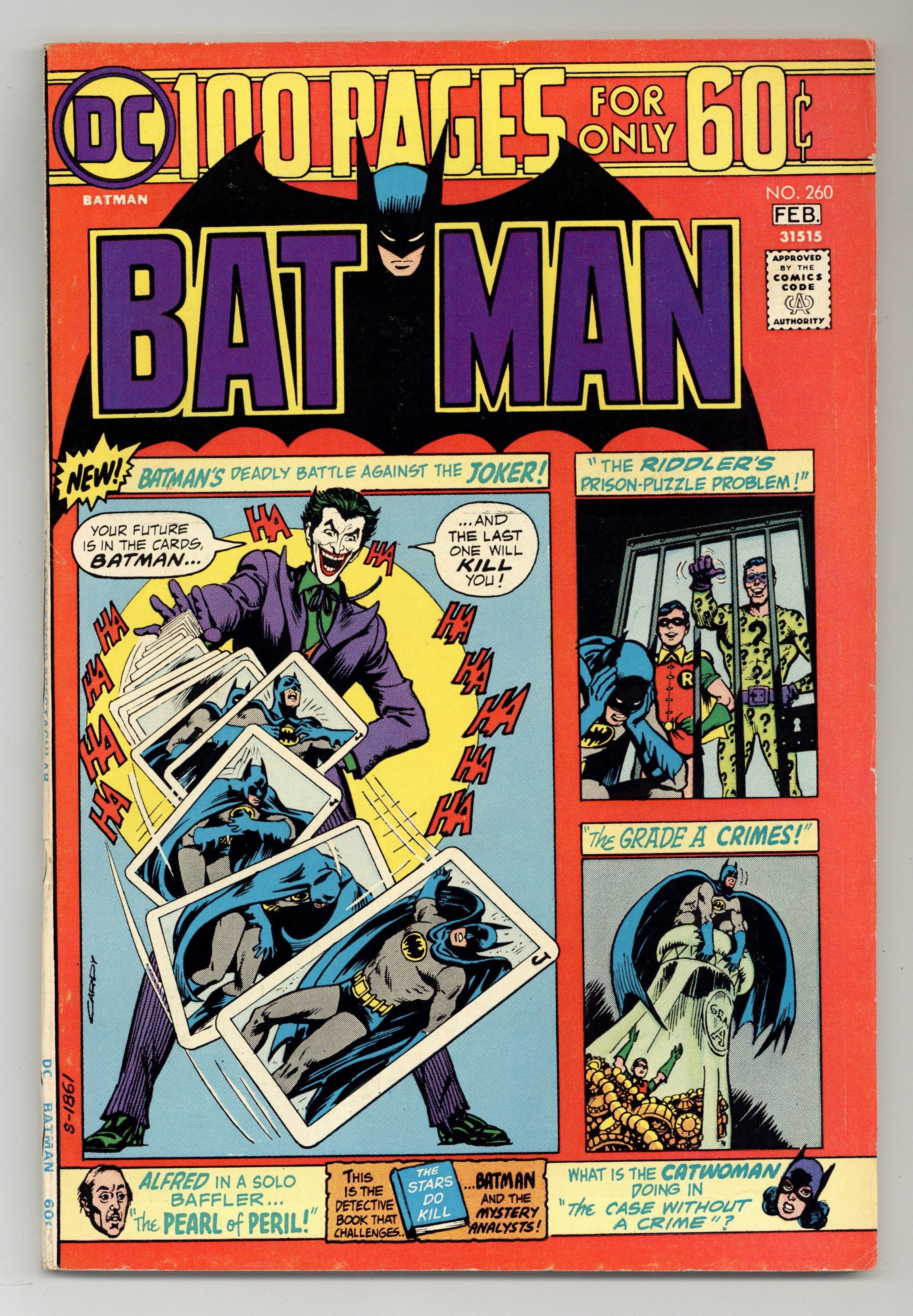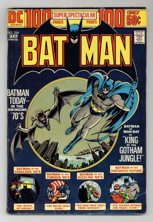 100-page giant. This issue features Batman tales from the forties, fifties, sixties, and seventies. Cover by Nick Cardy. "King of the Gotham Jungle!", script by Frank Robbins, pencils by Irv Novick, inks by Dick Giordano; The recent rash of unsolved robberies in Gotham City spurs Man-Bat to come out of retirement. "The Witch and the Manuscript of Doom," script by Bill Finger, pencils by Bob Kane, inks by Bob Kane and George Roussos (backgrounds); The Batman and Robin must track down The Witch, a mysterious figure responsible for the murder of Erik Dorne and the theft of a manuscript he wrote. "The Bullet-Hole Club!", script by Bill Finger, pencils by Dick Sprang (as Bob Kane), inks by Charles Paris; A private detective petitions Batman and the other members of the prestigious "Bullet Hole Club" to become a member---even if he has to purposely put himself in the way of bodily harm to do it! Shazam Awards Behind the Scenes at the DC Comic World article, pencils by Ross Andru and Bernie Wrightson, inks by Bernie Wrightson. "The Man Who Stole from Batman" (from Detective Comics #334), script by Gardner Fox, pencils by Sheldon Moldoff (as Bob Kane), inks by Joe Giella; A new and unusual villain makes him presence known by stealing from the Batman: his Batmobile, Bat-a-Rang, and Bat-Boat, yet Batman cannot figure out WHY he would do such a thing. "The Phenomenal Memory of Luke Graham!", script by Elliot S! Maggin, pencils by Dick Dillin, inks by Murphy Anderson; Luke Graham needs the help of Robin the Teen Wonder to convince his college professor that a report he prepared on the Chinese iron industry was not plagiarized. "The Son of the Joker" (from Batman #145), script by Bill Finger, art by Sheldon Moldoff (as Bob Kane); In this imaginary story, penned by Alfred, trusted butler of Bruce Wayne, the Second Batman & Robin team run up against the Son of the Joker! Bat-Maze activity page. "The Guardian of the Bat-Signal!" (from Batman #85), script by Edmond Hamilton, pencils by Bob Kane, inks by Charles Paris; A long-time veteran of the Gotham City Police Department is about to be retired, when Batman suggests that he be put in charge of the Bat-Signal. 100 Pages, Full Color. Cover price $0.50.