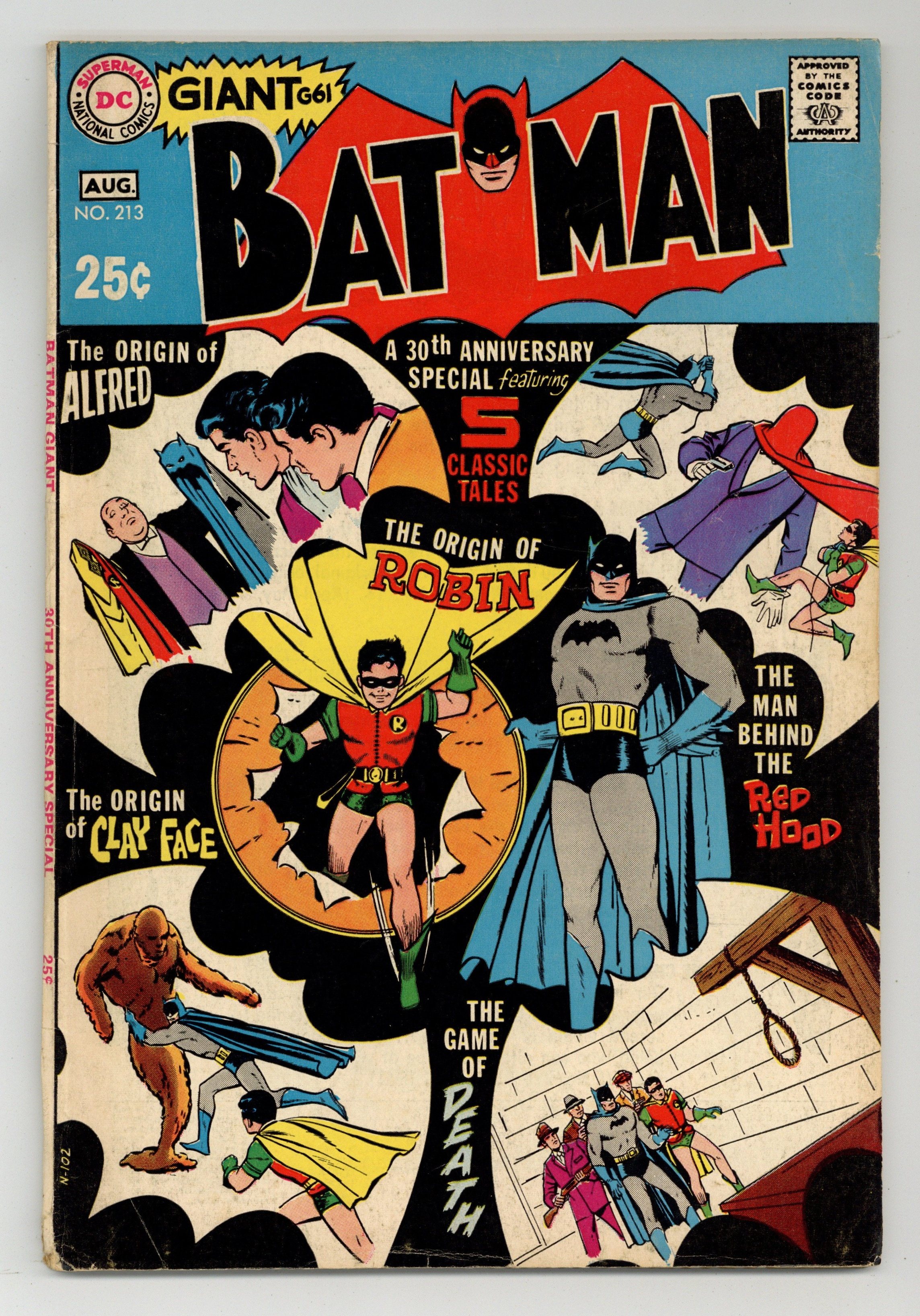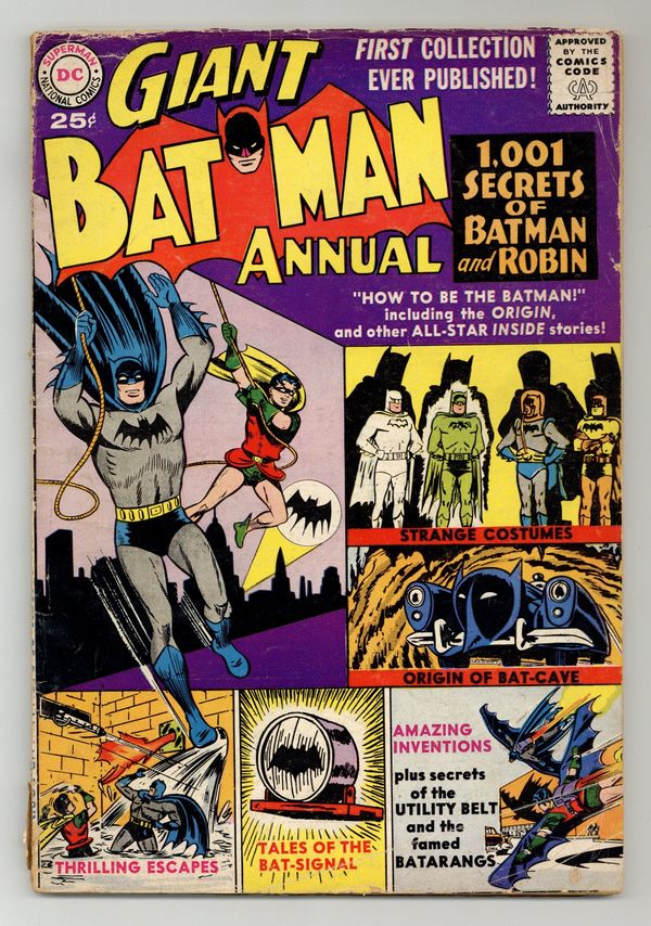 All reprints. Cover pencils by Curt Swan, Sheldon Moldoff, and Dick Sprang, inks by Charles Paris. "How to Be the Batman!", pencils by Lew Sayre Schwartz, inks by Charles Paris; Batman loses his memory after being exposed to amnesia gas, when the antidote fails, Robin must teach the Cowled Crimefighter all that he has forgotten; Origin retold. "The Strange Costumes of Batman!", script by Edmond Hamilton, pencils by Dick Sprang, inks by Charles Paris; A look at some of the specialized costumes that Batman has utilized over his career, including one garment that he had hoped never to use. "Untold Tales of the Bat-Signal!", script by David Vern, pencils by Lew Sayre Schwartz, inks by Charles Paris; Reporter Dave Purdy saves Batman by dazzling an approaching murderer with the Bat Signal; The Masked Manhunter is happy to let Purdy have the credit. Secrets of Batman's Utility Belt; Famed Batarang. "The Origin of the Bat-Cave!", script by Bill Finger, pencils by Sheldon Moldoff, inks by Charles Paris; Professor Nicholls sends the Dynamic Duo back in time 300 years, there they meet Jeremy Coe, a frontiersman spy who doubles as a Red Indian. "Batman's Electronic Crime-File!", pencils by Dick Sprang, inks by Charles Paris; The microfilm from Batman's crime file is stolen from the Bat-Cave. "Thrilling Escapes of Batman and Robin!", pencils by Sheldon Moldoff, inks by Charles Paris; Villainous Paul King captures Batman and Robin, he then sets about devising an inescapable trap, based on Robin's recollections about their previous ingenious escapes. "The Amazing Inventions of Batman," script by Edmond Hamilton, pencils by Dick Sprang, inks by Charles Paris; Batman gets word that one of his inventions is to be used against him, he and Robin must then examine their many crime fighting innovations for clues. Superman ad. Secret Origins ad. Batman with Robin the Boy Wonder ad. 84 pgs., full color. Cover price $0.25.