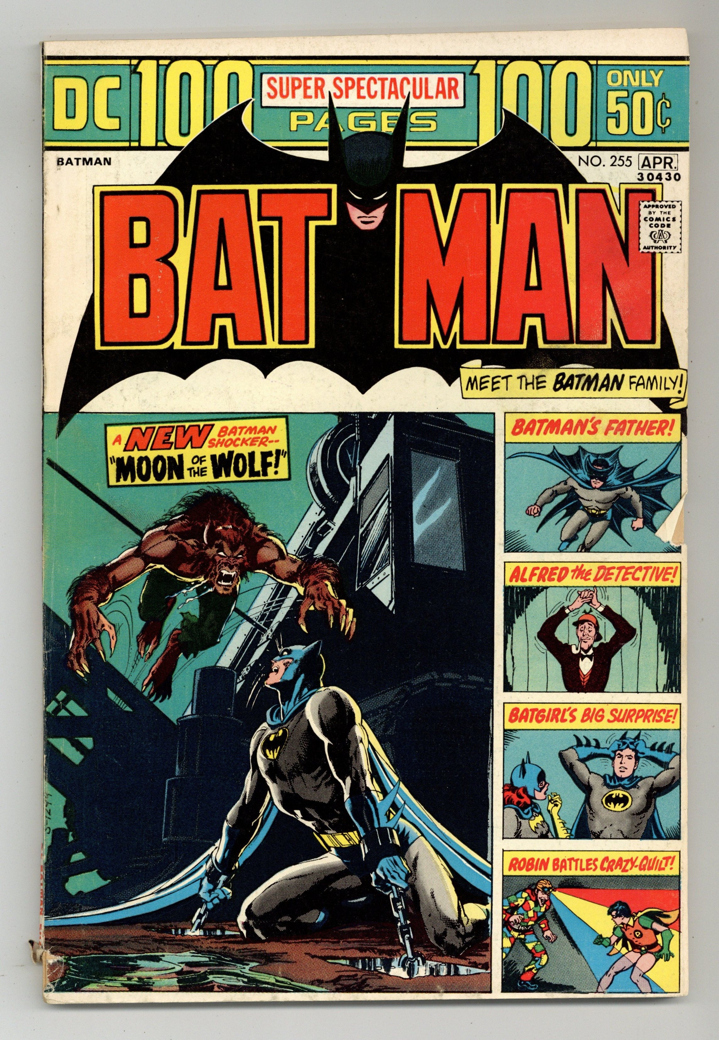 New story, "Moon of the Wolf." (script by Len Wein, pencils by Neal Adams, inks by Dick Giordano; 20 pages). Reprints: "The First Batman" (script by Bill Finger, art by Bob Kane; from Detective # 325), "The Duped Domestics" (art by Jerry Robinson; from Batman # 22), Batgirl guest stars in "The True-False Face of Batman" (script by Gardner Fox, pencils by Carmine Infantino, inks by Sid Greene; from Detective # 363), Robin in "Crazy-Quilt Comes Back!" (script by France E. Herron, art by Jim Mooney; from Star-Spangled Comics # 123), and "The Outsider Strikes Again" (script by Gardner Fox; from Detective # 340). Letters to the editor from comics writers Elliot S. Maggin and Mike Barr. 100 Pages, Full Color. Cover price $0.50.