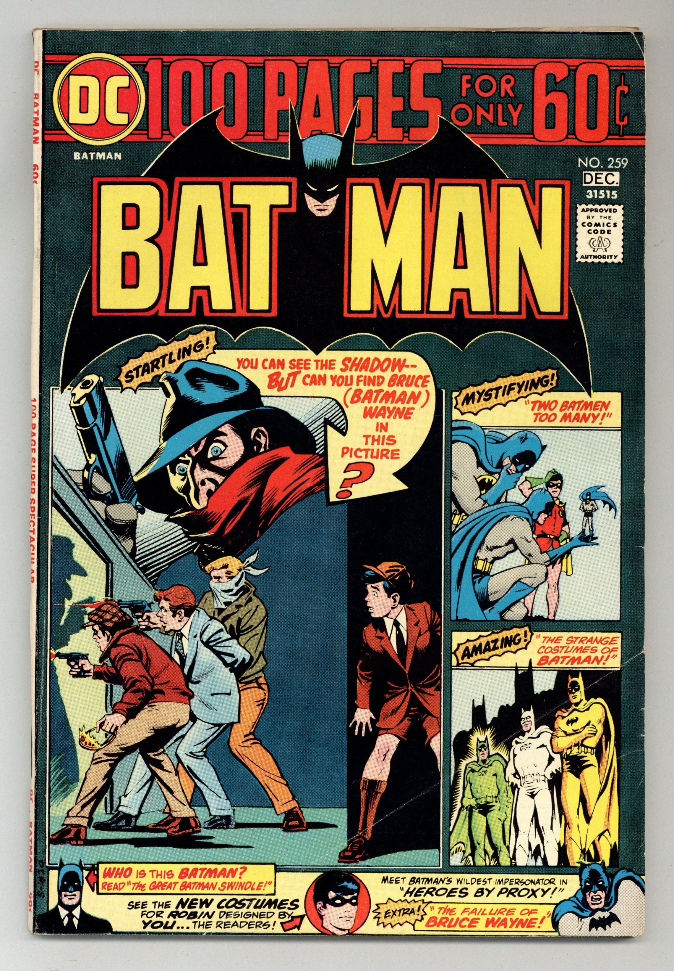 100-page giant. Cover art by Nick Cardy. Batman and the Shadow team-up in this issue in a new story titled "Night of the Shadow!", script by Denny O'Neil, pencils by Irv Novick, inks by Dick Giordano); Batman goes on the trail of a convicted felon from the past, believing that he has stolen a valuable tiara. But he's wrong and discovers that only "The Shadow Knows" who actually is responsible. "The Great Batman Swindle!" (reprinted from Detective Comics #222), script by Bill Finger, pencils by Dick Sprang, inks by Charles Paris; Wealthy yachtsman Ned Judson is called to a mysterious castle once built by an eccentric millionaire, and comes face-to-face with the Brotherhood of Batmen; The leader, Batman Number One, convinces Judson that the figure of Batman is actually four people. "The Strange Costumes of Batman!" (from Detective Comics #165), script by Edmond Hamilton, pencils by Dick Sprang (as Bob Kane), inks by Charles Paris; While making an inspection of equipment in the Bat-Cave, Bruce and Dick also must inspect the various costumes Batman and Robin use in their fight against crime for leaks and tears, and, as it turns out, a never before used costume saves the day for the Batman, who has been seriously wounded. New costumes for Robin drawn by readers of the strip. "Heroes by Proxy!" (from Batman #29), script by Don Cameron, art by Dick Sprang (as Bob Kane); Two private detectives are down in the dumps because they are flat broke, even though they have great detective abilities; When they hear that the Wayne Mansion has been robbed, they decide to change their tactics and investigate, disguised as Batman and Robin! "Two Batmen Too Many!" (from Batman #177), script by Bill Finger, pencils by Sheldon Moldoff (as Bob Kane), inks by Joe Giella; Batman concocts a scheme against numbers racketeer Ed Garvey to prove conclusively that the crook planned and carried out the Kimber Gem job. "The Failure of Bruce Wayne" (from Batman #120), script by Bill Finger, pencils by Sheldon Moldoff, inks by Charles Paris; Called to his dying Uncle's bedside, Silas, Bruce is told by him that he is disappointed that Bruce has not continued the family tradition of adventure; Bruce sets out to prove Silas wrong. 100 Pages, Full Color. Cover price $0.60.