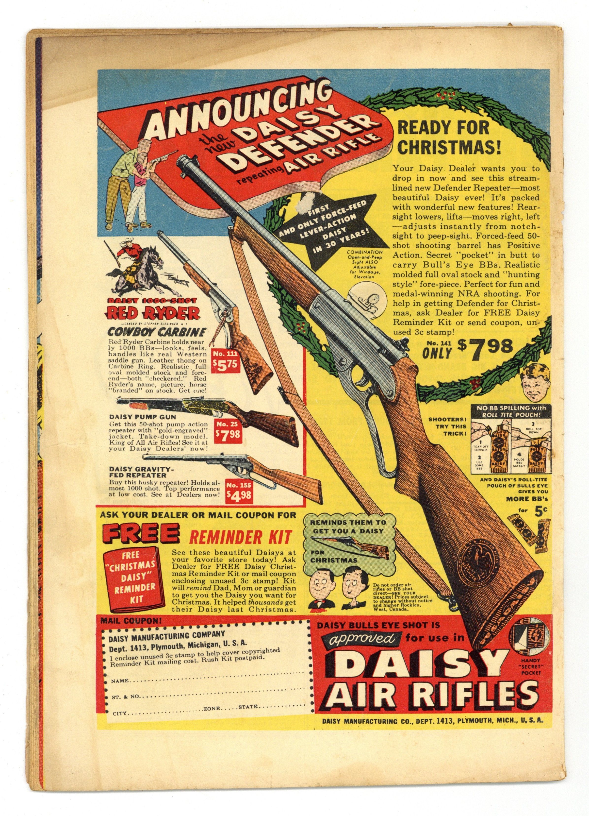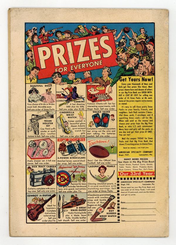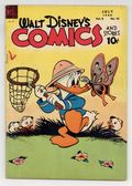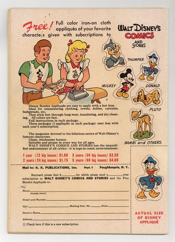 Cover by Walt Kelly. Stories and art by Carl Barks, Floyd Gottfredson, Merrill De Maris, Dick Moores, Bob Karp, Ralph Heimdahl, Paul Murry, Chase Craig, Gil Turner, Don Gunn, George Waiss, Bill Wright, Sylvia Holland, and Al Taliaferro. Sometimes listed as Vol. 7 #11. The long-running vehicle for Disney character comics featured work by Carl Barks, Floyd Gottfredson, and Pogo's Walt Kelly. In a classic story from the Mickey Mouse comic strip, Mickey matches wits with a mesmerist who uses his act for jewel theft. In a story by Barks, Donald wants to relax on vacation, but door-to-door salesmen keep interrupting. In part two of a comics adaptation of Disney's Bongo, Bongo the circus bear runs away to the forest. Donald Duck; Bucky Bug; Li'l Bad Wolf; Mickey Mouse; Bongo; Wide Open Spaces; A 4th to Remember; Mickey Mouse: The Jewel Robbery. 48 pages, Full Color. Cover price $0.10.
